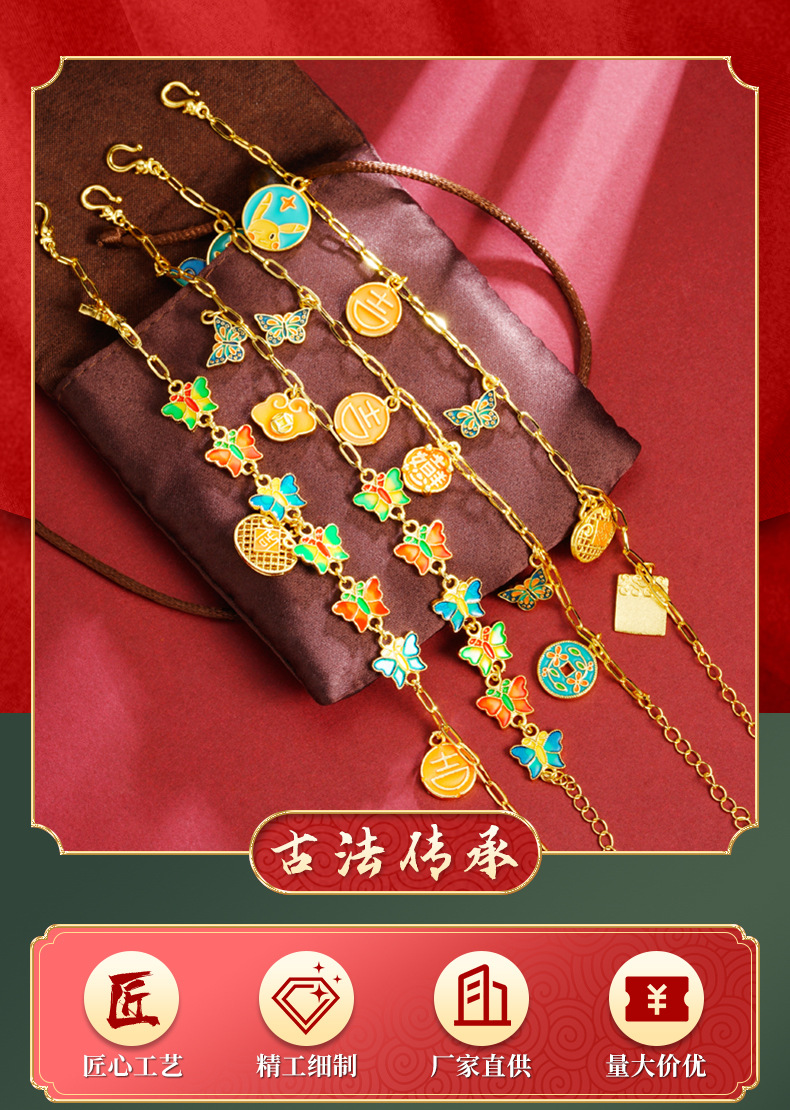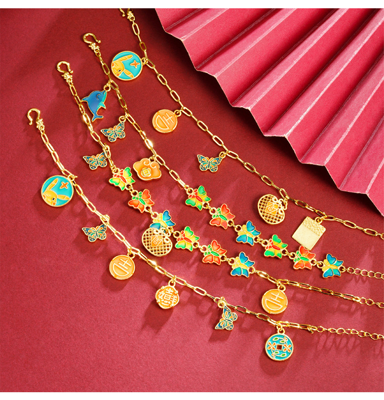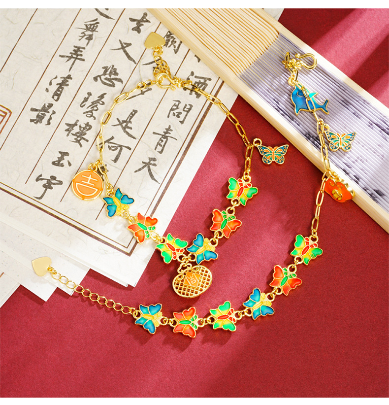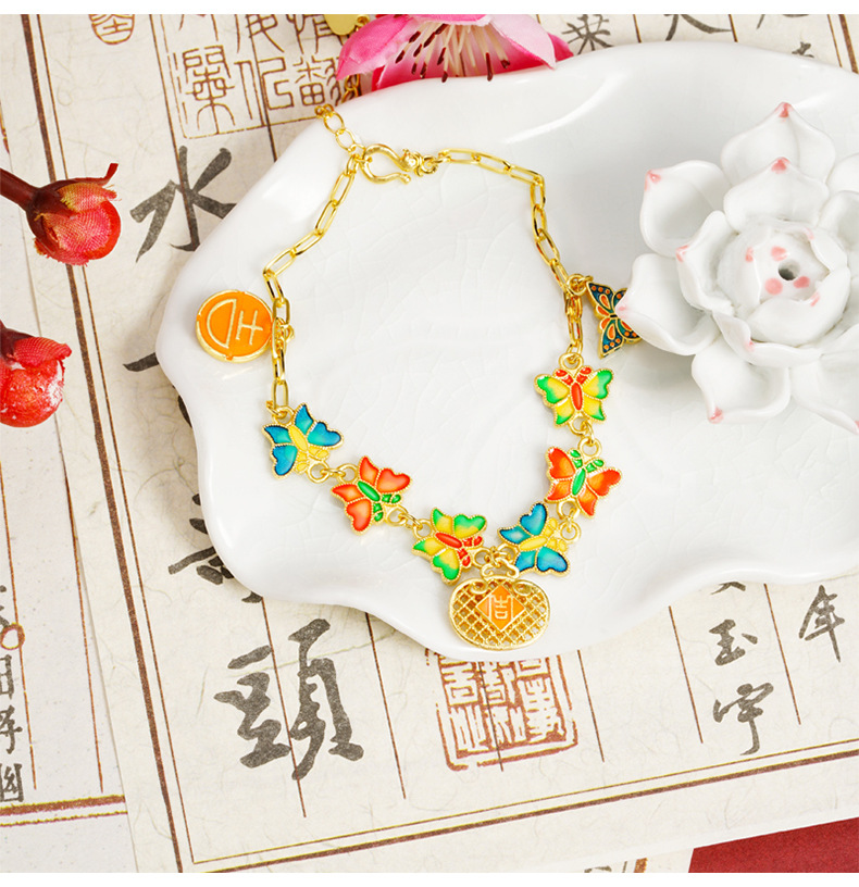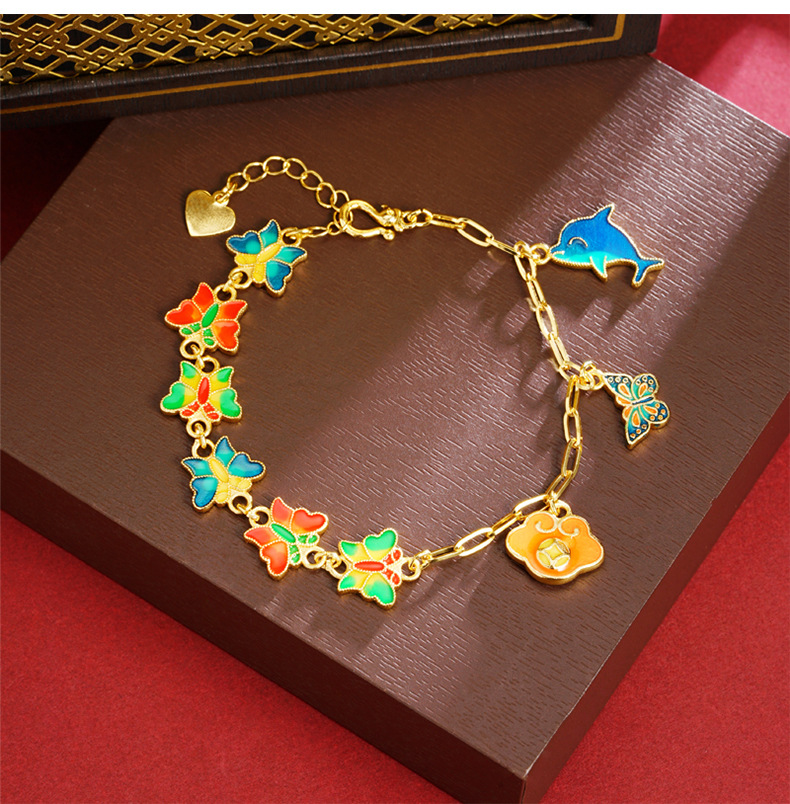 Guochao antiguo pulsera de oro esmalte retro goteo de aceite mariposa brilla pulsera mujer joyas de mano no se desvanecen