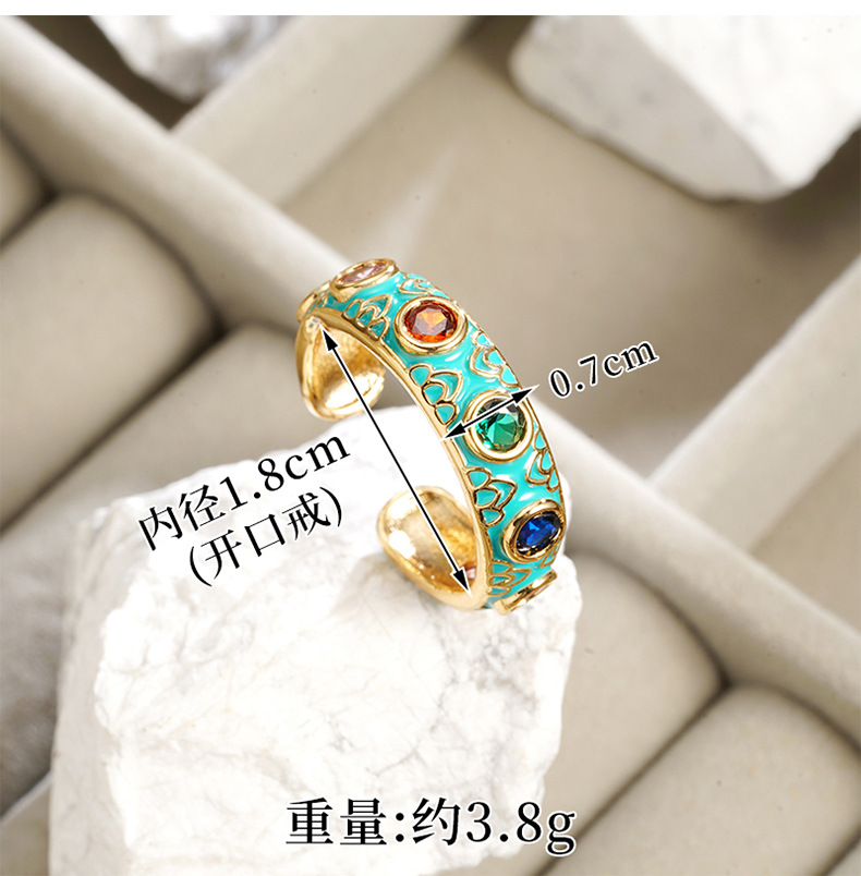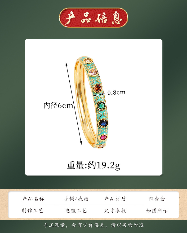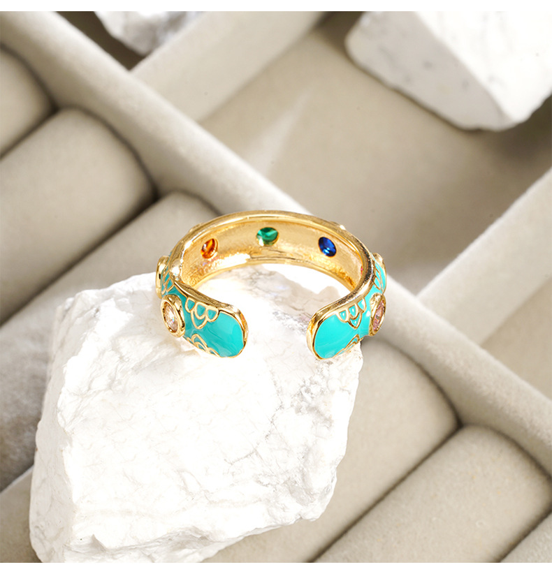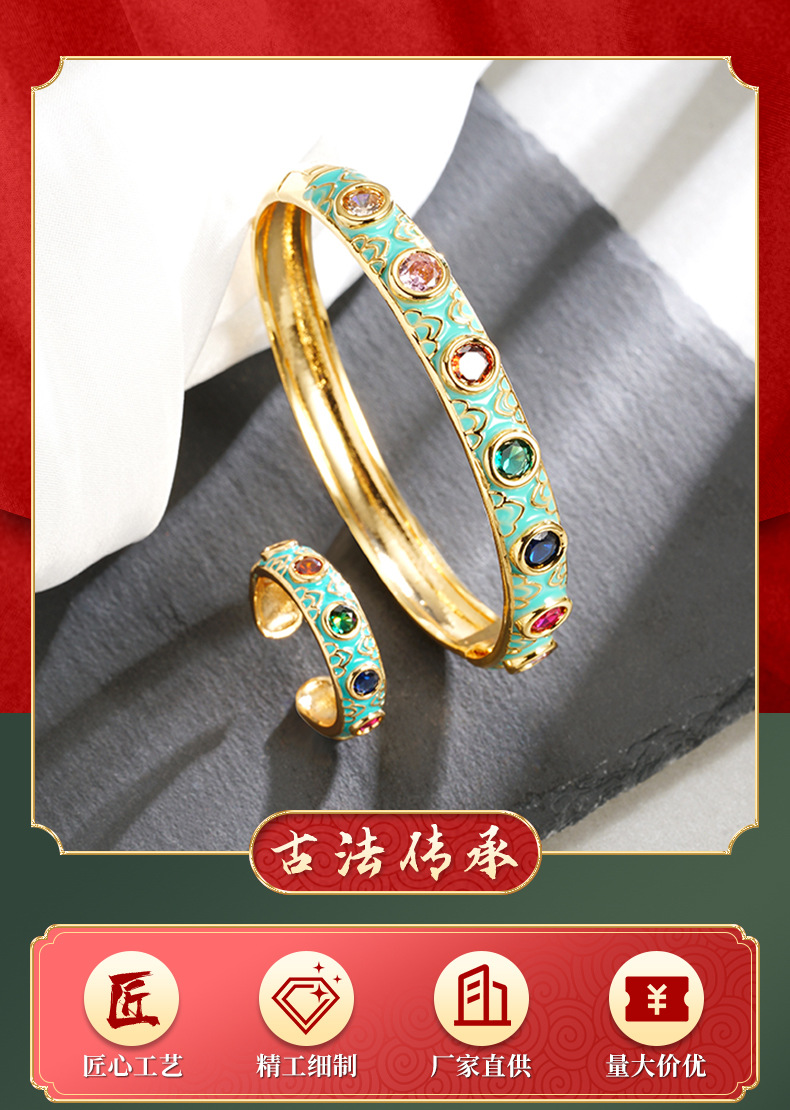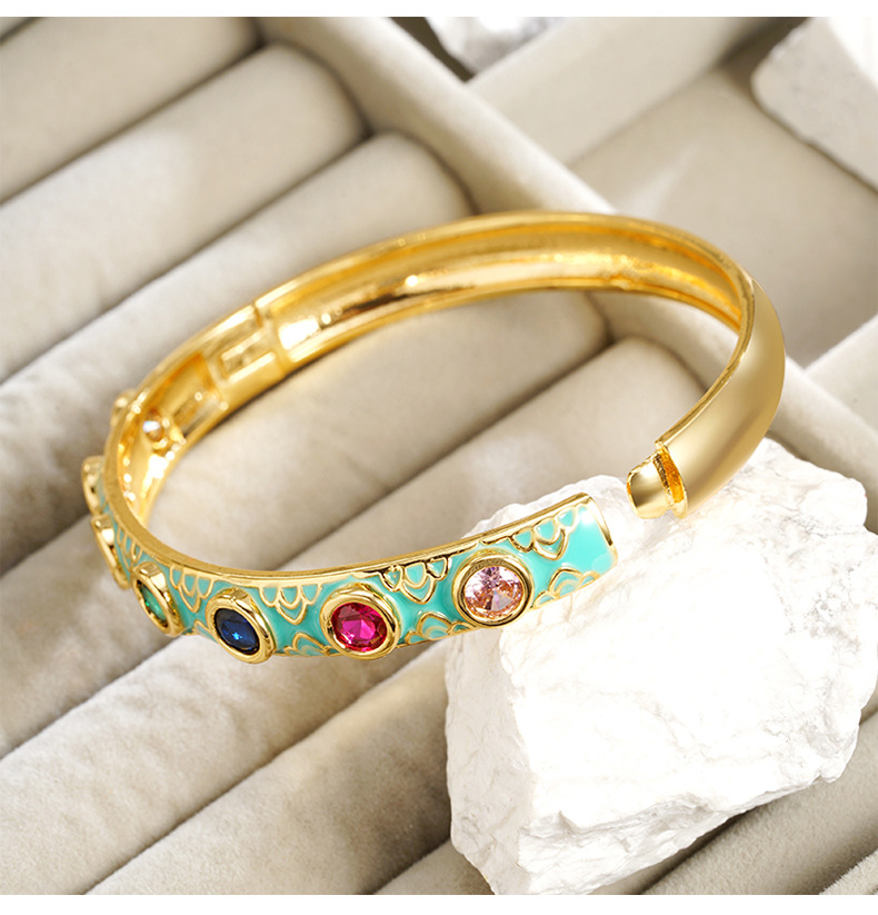 Nuevo estilo chino antiguo oro galvanizado 18k pulsera ligera de lujo colorido zirconio goteo de aceite anillo abierto joyas de nicho
