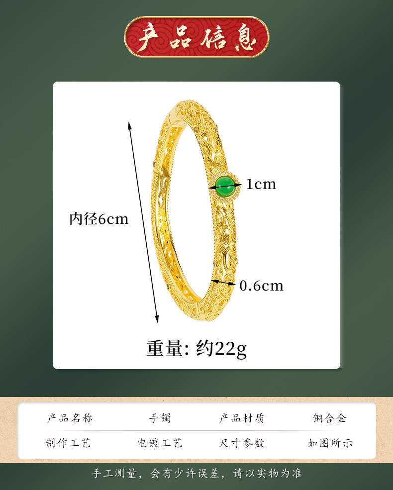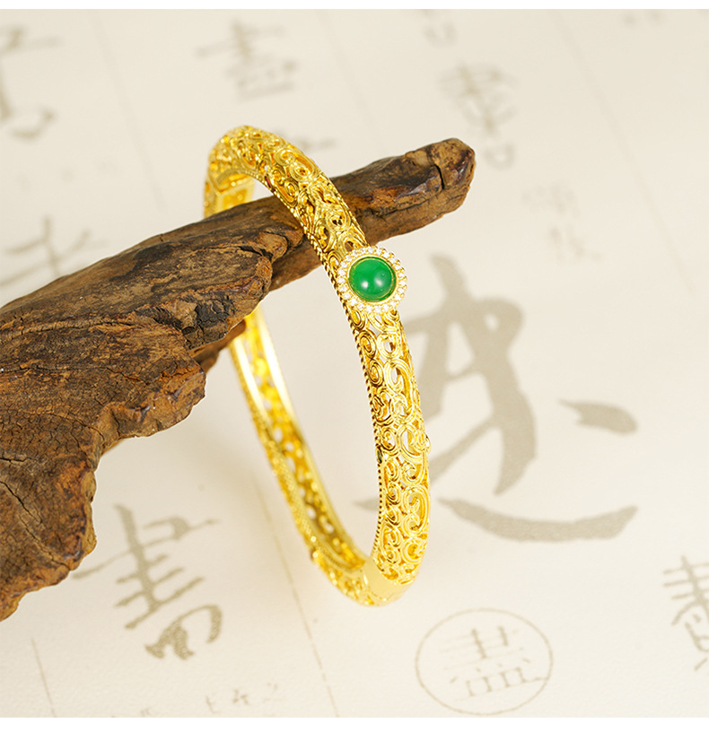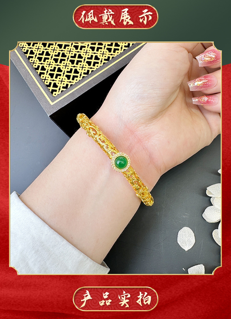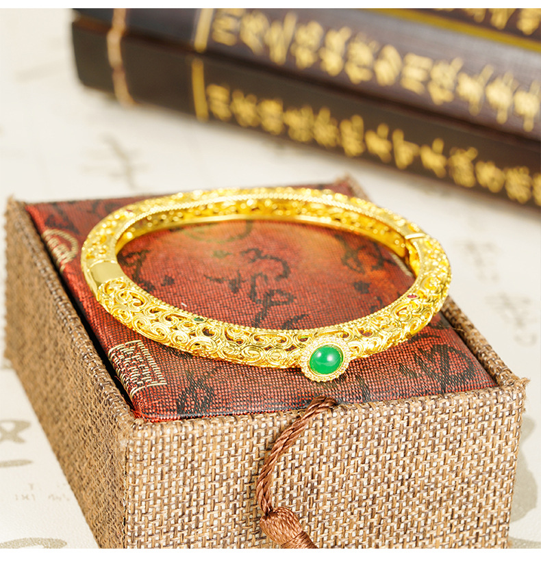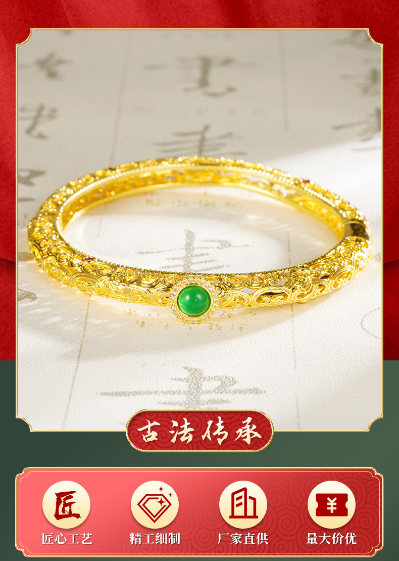 Brazalete de estilo nacional de oro de arena hueco de medula de jade estilo de moda lujoso temperamento ligero palacio flor de escultura Yiwu bronce joyas chapadas en oro al por mayor