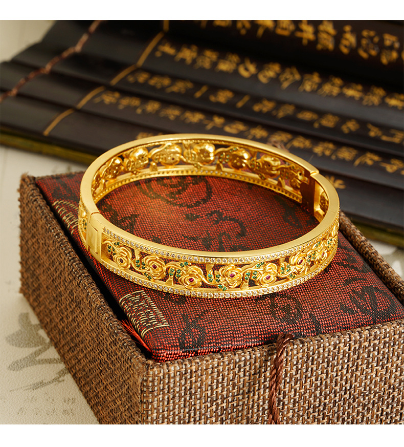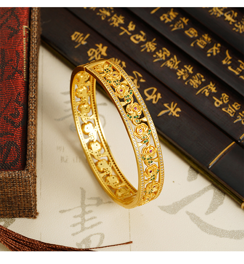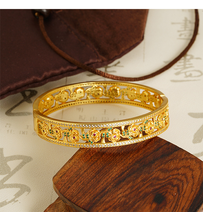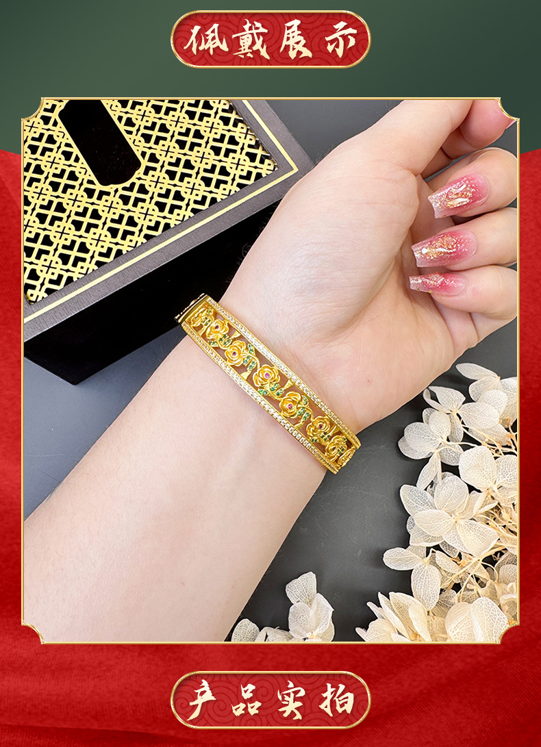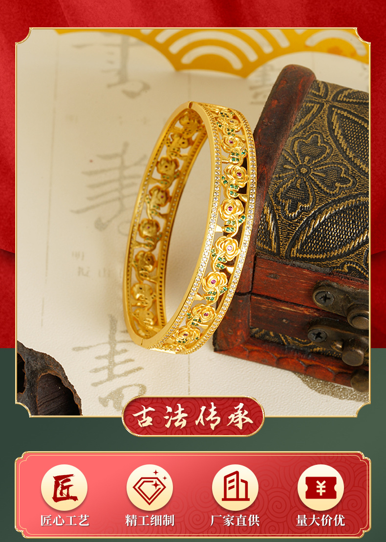Brazalete de flores de oro hueco de Vietnam, brazalete de hebilla de hebilla de flores para niños populares, lujo ligero, joyería de cobre al por mayor.