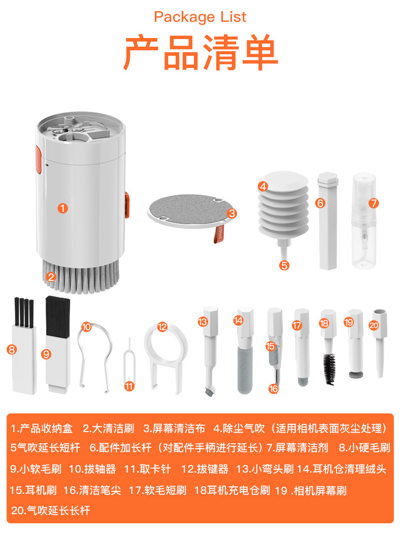 | Colores | Conjunto de limpieza 21 en 1,Botón blanco 20 en 1 naranja (incluido líquido de limpieza),Botón amarillo negro veinte en uno (incluido líquido de limpieza),Kit de limpieza 18 en 1 (incluido líquido de limpieza),Kit de limpieza 19 en 1 (incluido líquido de limpieza),Kit de limpieza multifuncional blanco ocho en uno (incluido líquido de limpieza),Kit de limpieza multifuncional rosa ocho en uno (incluido líquido de limpieza),Kit de limpieza multifuncional ocho en uno negro (incluido líquido de limpieza),Kit de limpieza multifuncional gris-negro ocho en uno (incluido líquido de limpieza),Kit de limpieza multifuncional azul ocho en uno (incluido líquido de limpieza),Kit de limpieza 5 en 1 (5 ml de detergente incluido),21 en uno en caja |