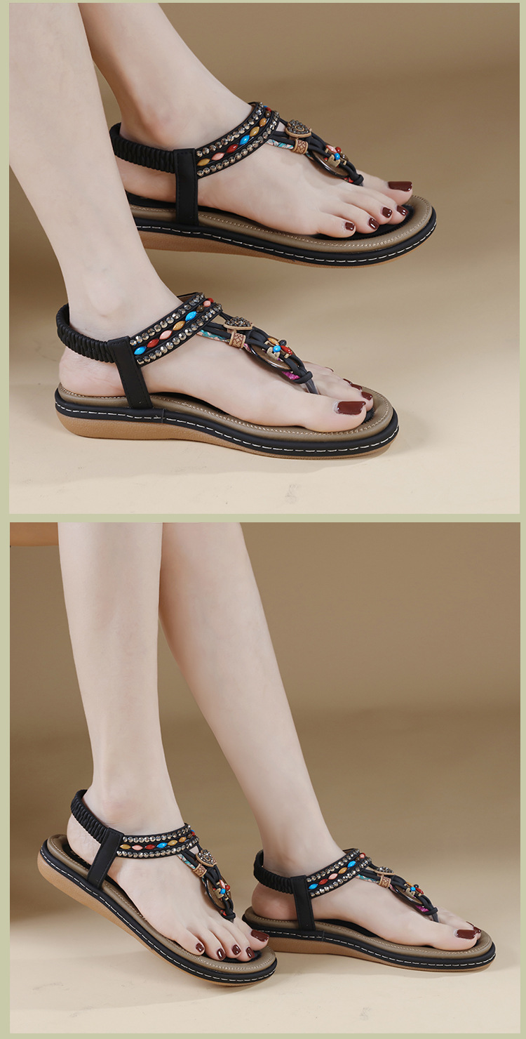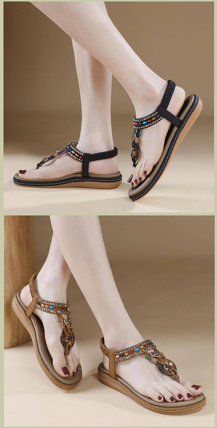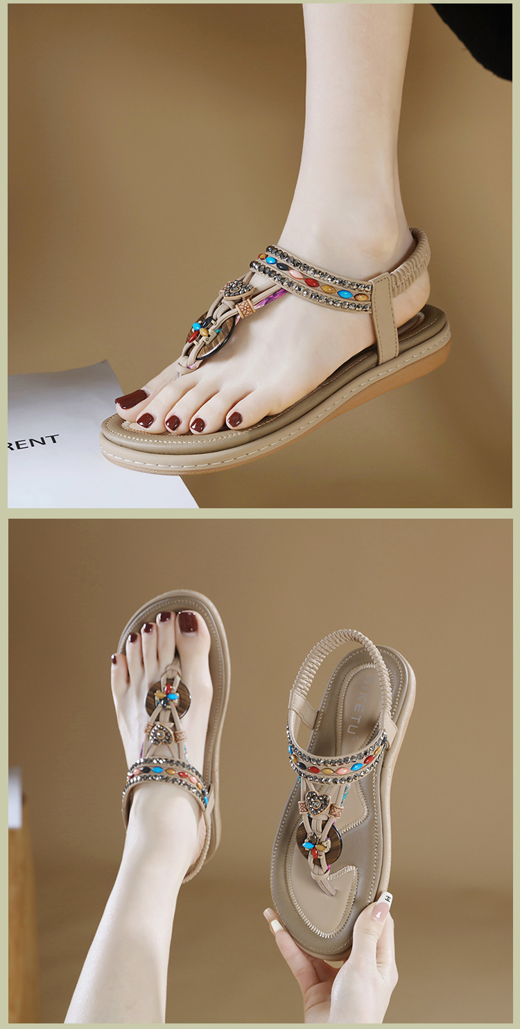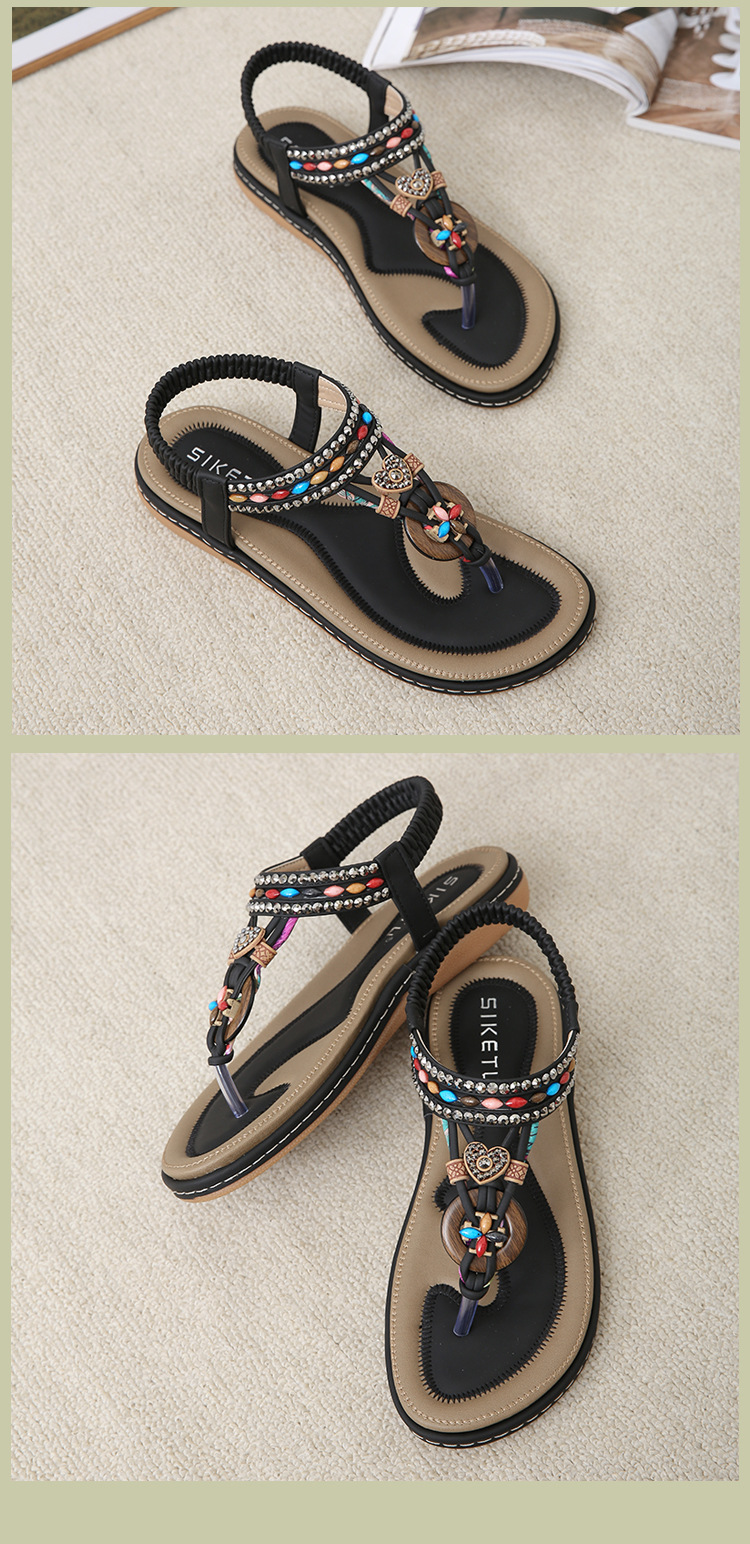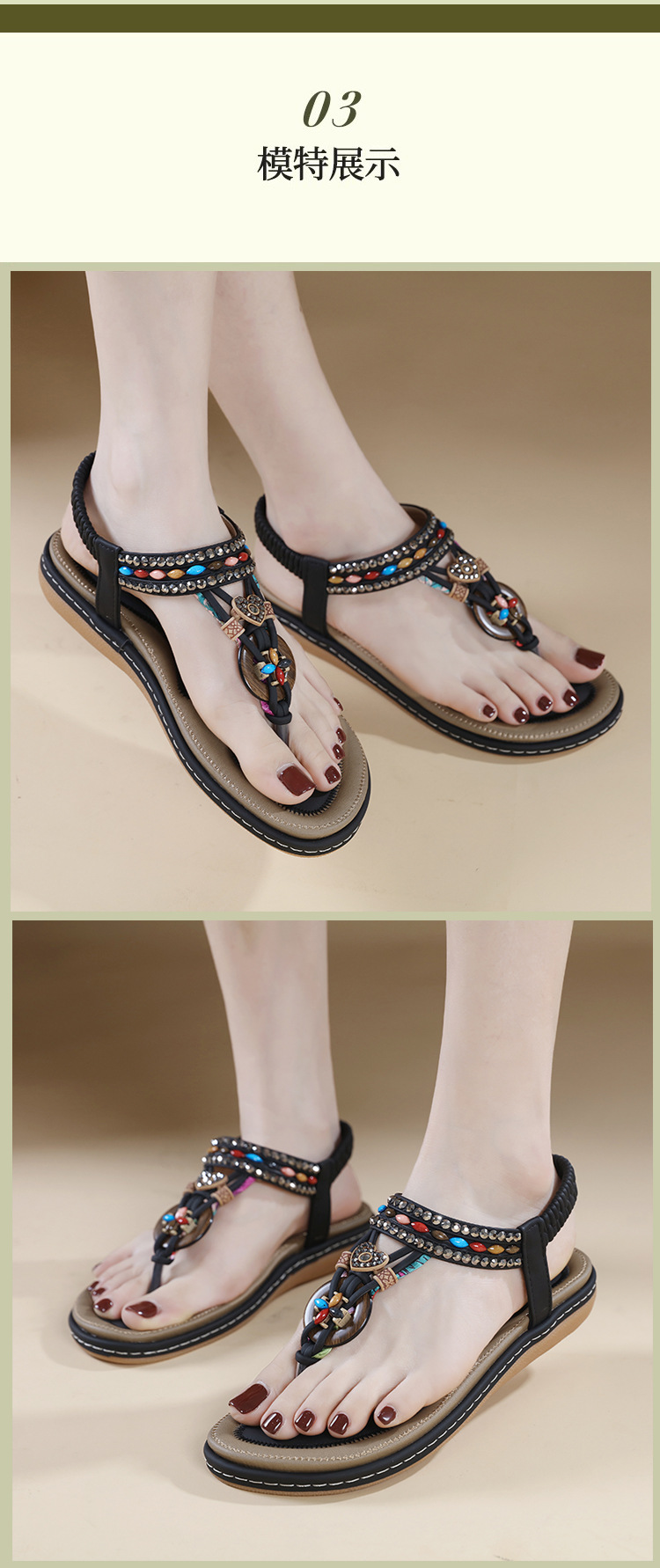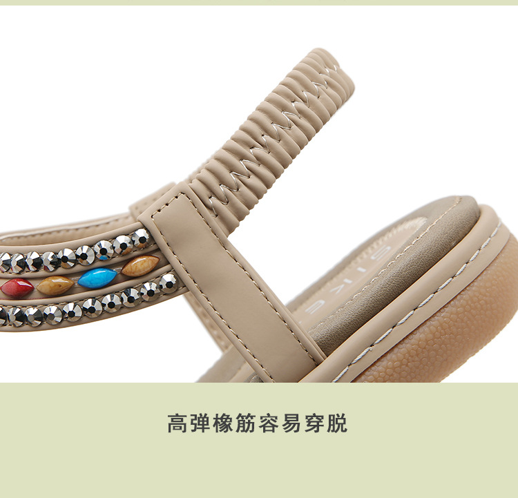 W676-2 Nuevas Sandalias Planas de Moda Casual Transfronterizas 2025 con Hebilla de Cuentas de Madera y Pedrería para Mujer, Playa de Tailandia