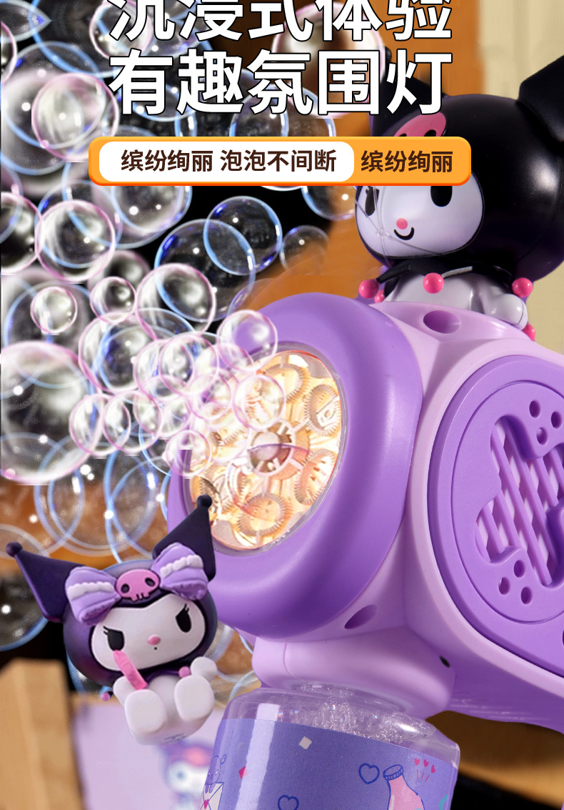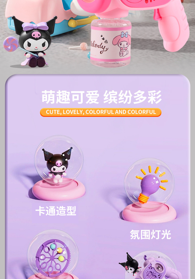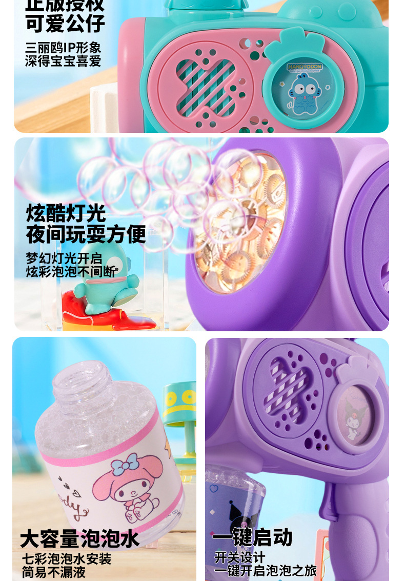 | Colores | Pistola de burbujas Sanrio,Sanrio Bubble Gun-Handon Ugly Fish,Pistola de burbujas Sanliot-Kulomi,Pistola de burbujas Sanliot-Meliti |
