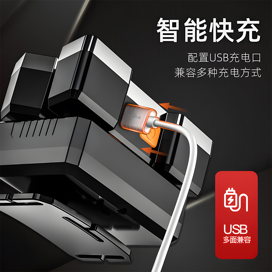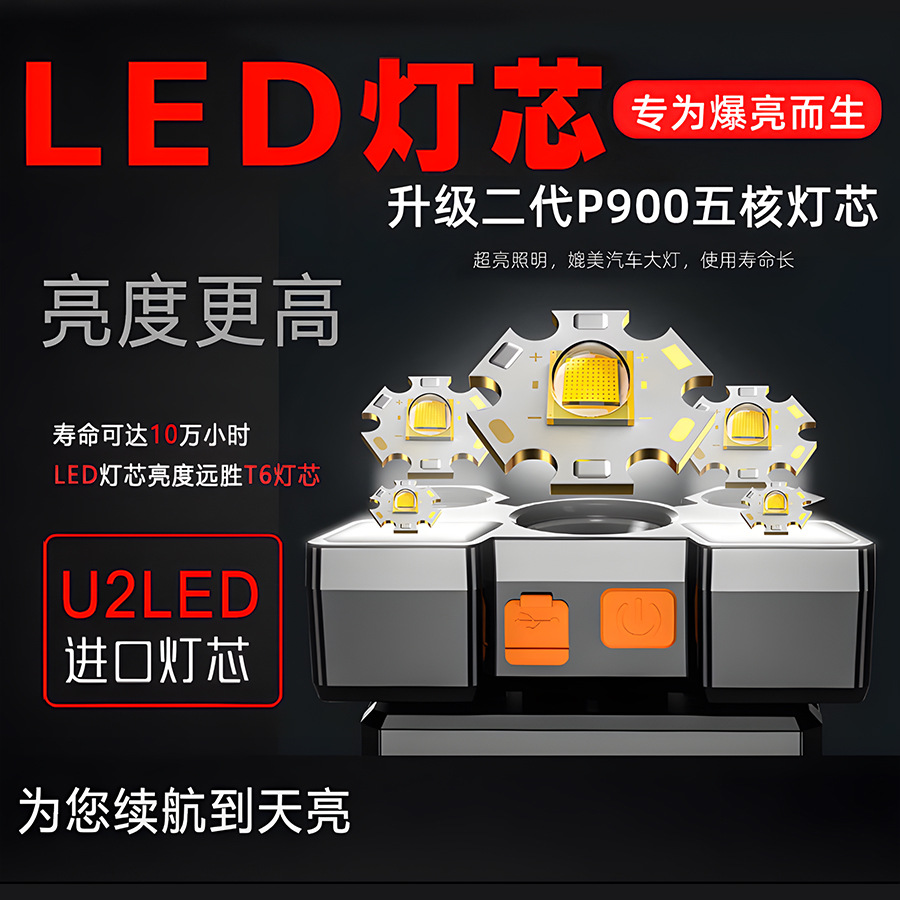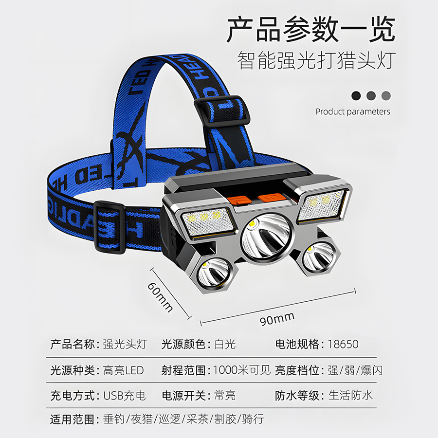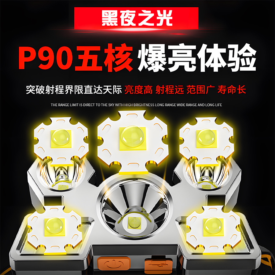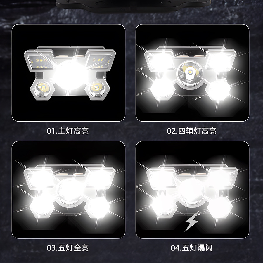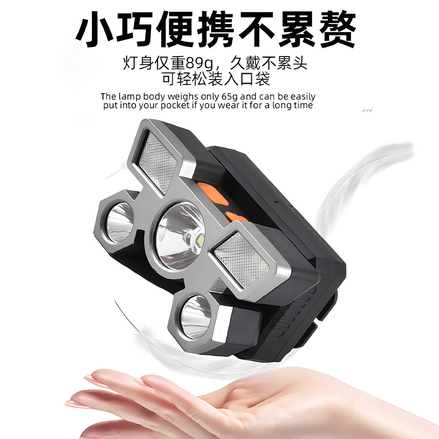 Transfronterizos nuevos fuertes cabezales ligeros led cinco cabezas de avión lámpara USB recargable cabeza pequeña linterna al aire libre lámpara de minería