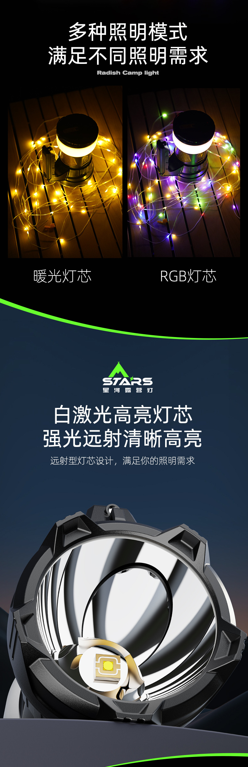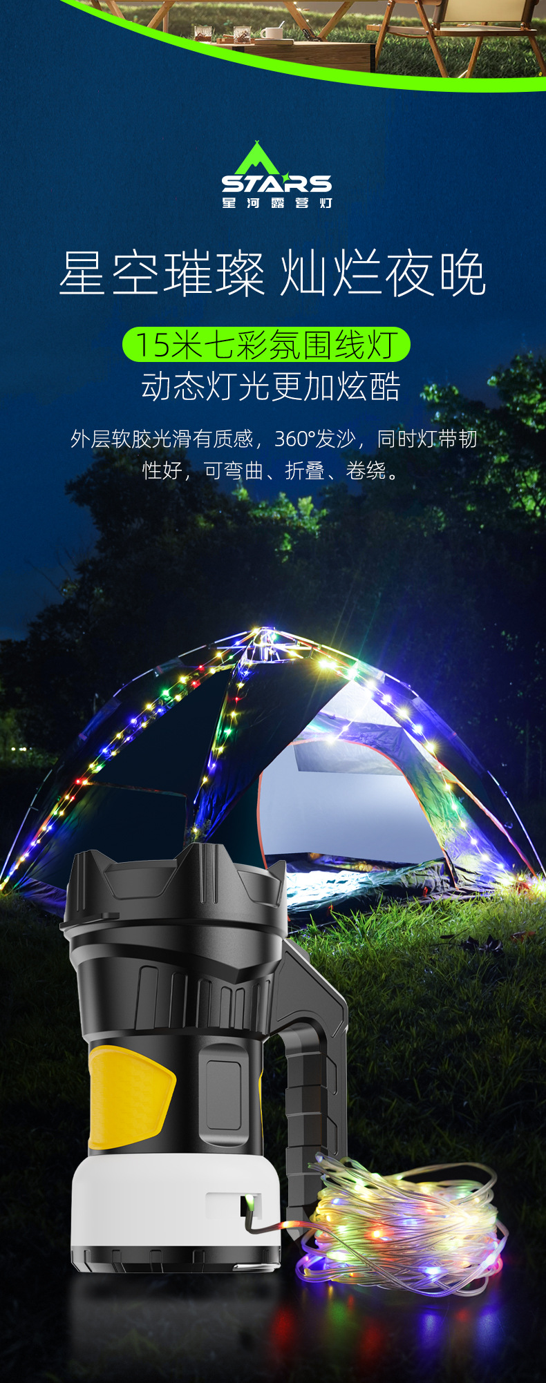 Camping transfronterizo luz de campo colorida cadena de luz láser rojo y blanco mecha de luz de dedo estrella luz de camping al aire libre