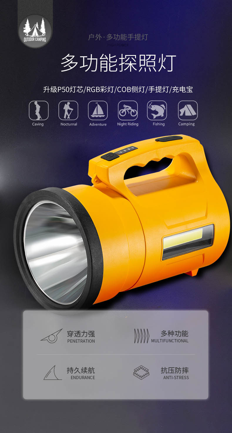 Nuevos productos transfronterizos RGB lámpara de mano de búsqueda de viaje al aire libre luz de búsqueda de luz de larga duración P50 lámpara de mano