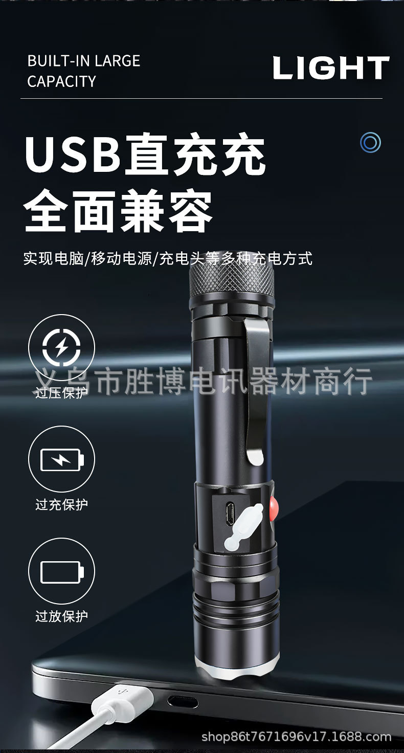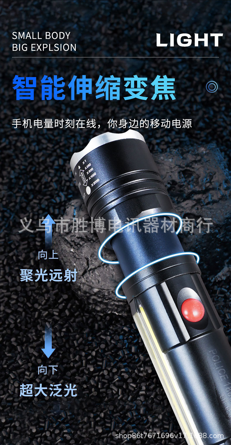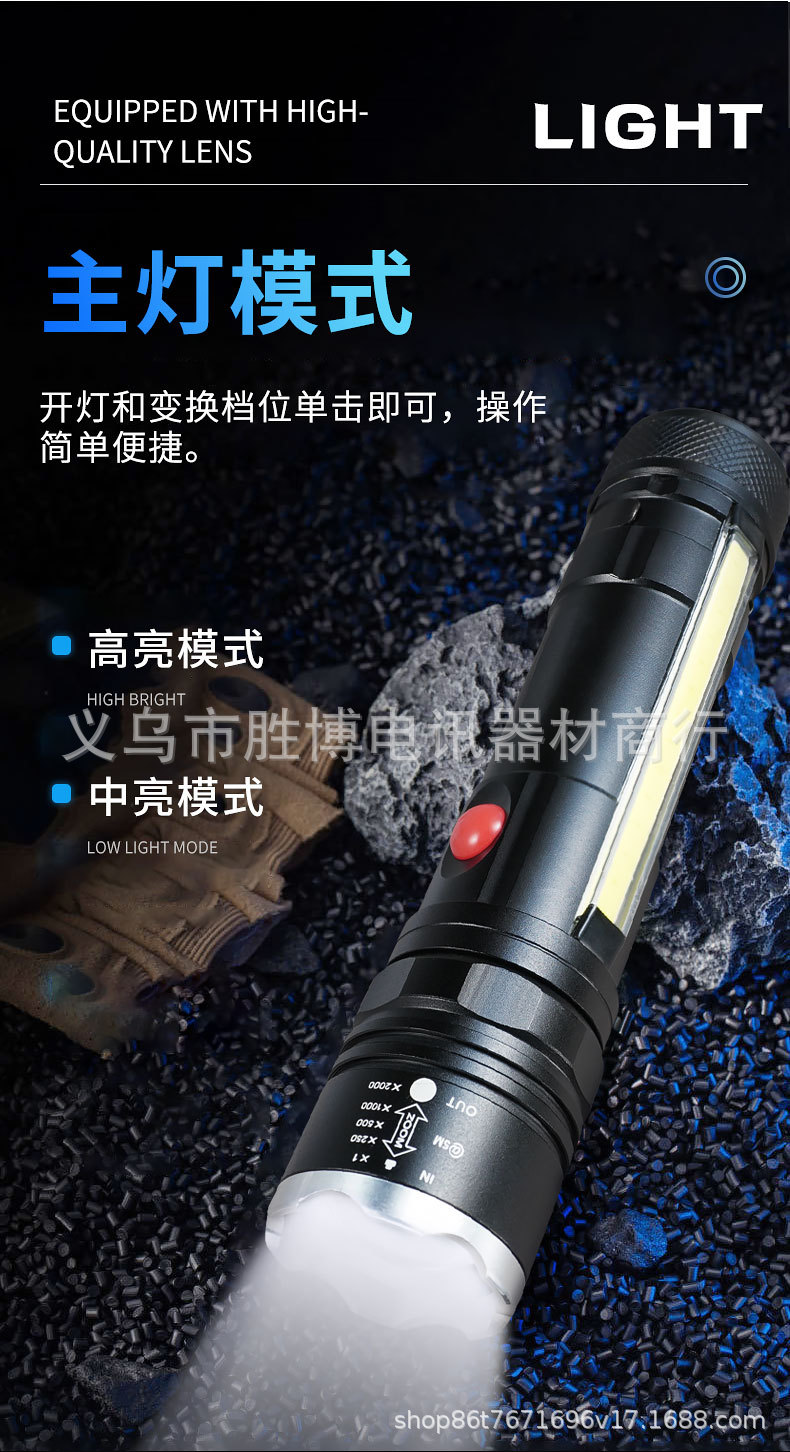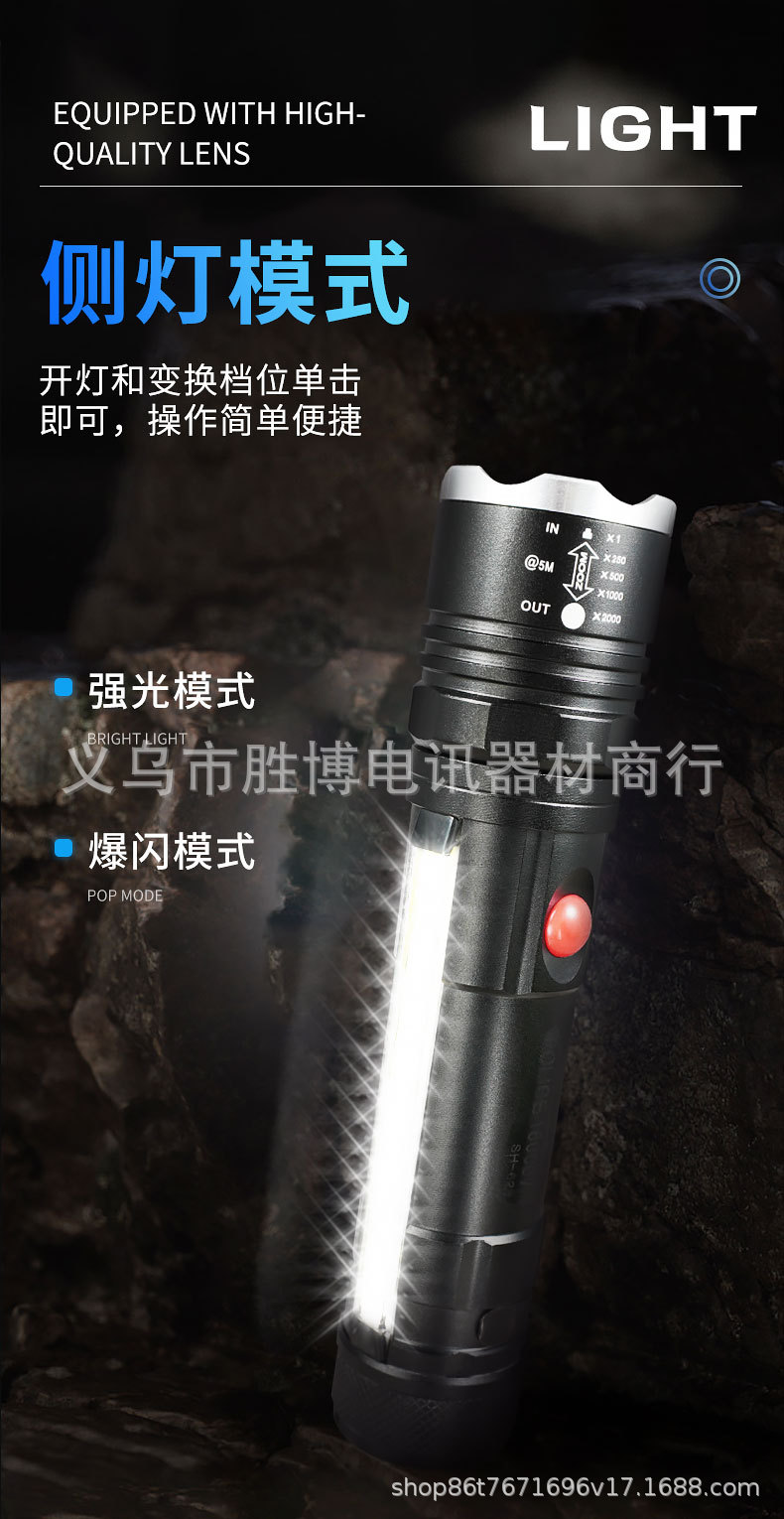 Transfronterizo T6 linterna telescópica zoom luz intensa al aire libre con imán COB lámpara lateral de aleación de aluminio linterna carga USB