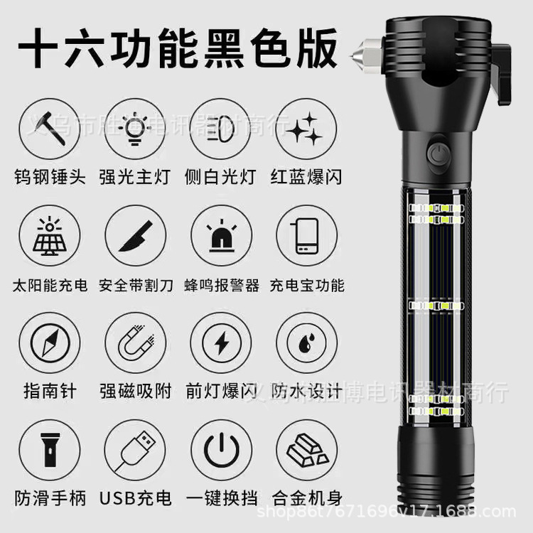 Lintera de seguridad multifuncional de martillo de automóvil luz de advertencia parpadeante roja y azul ventana rota alarma de martillo de escape carga solar