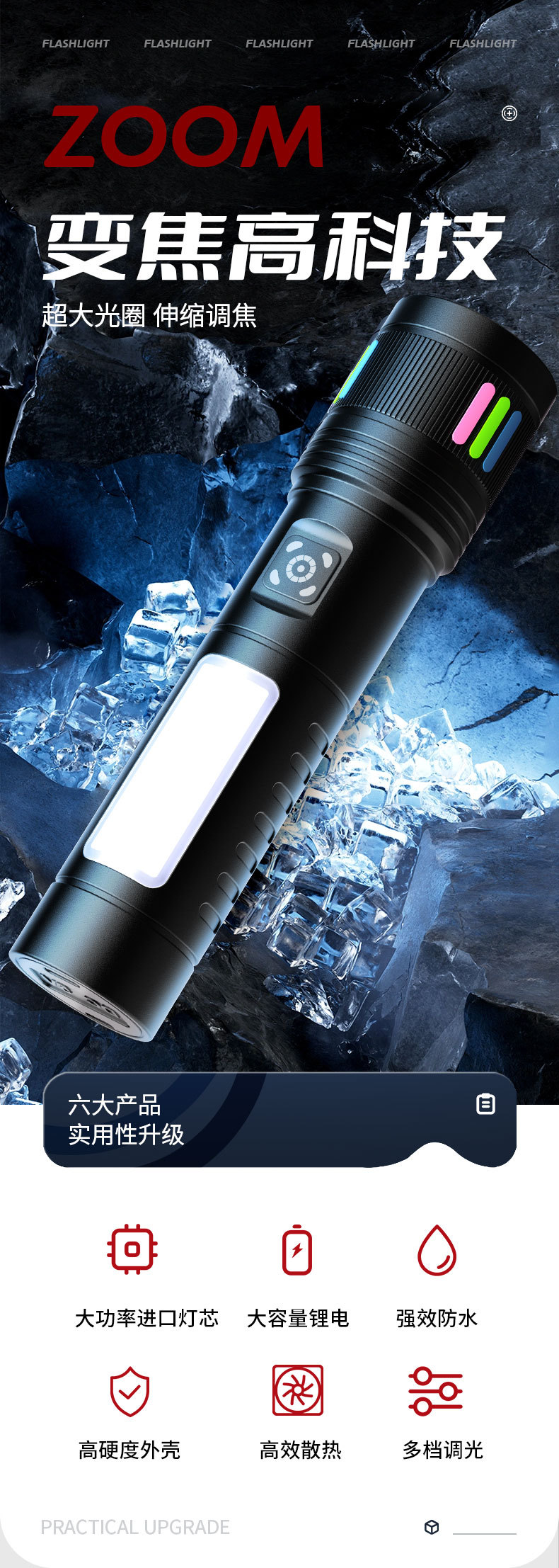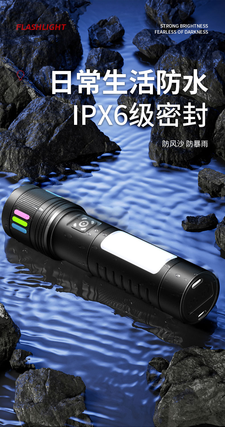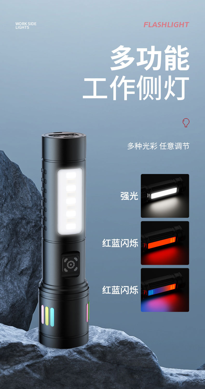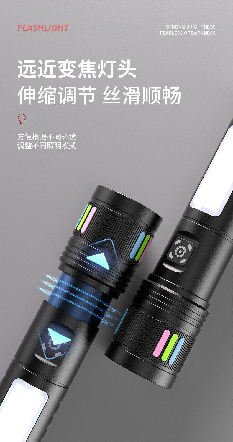 Luz transfronteriza al aire libre pequeña linterna de acero linterna de color fluorescente tira de zoom telescópico lámpara lateral de aleación de aluminio de disparo remoto linterna