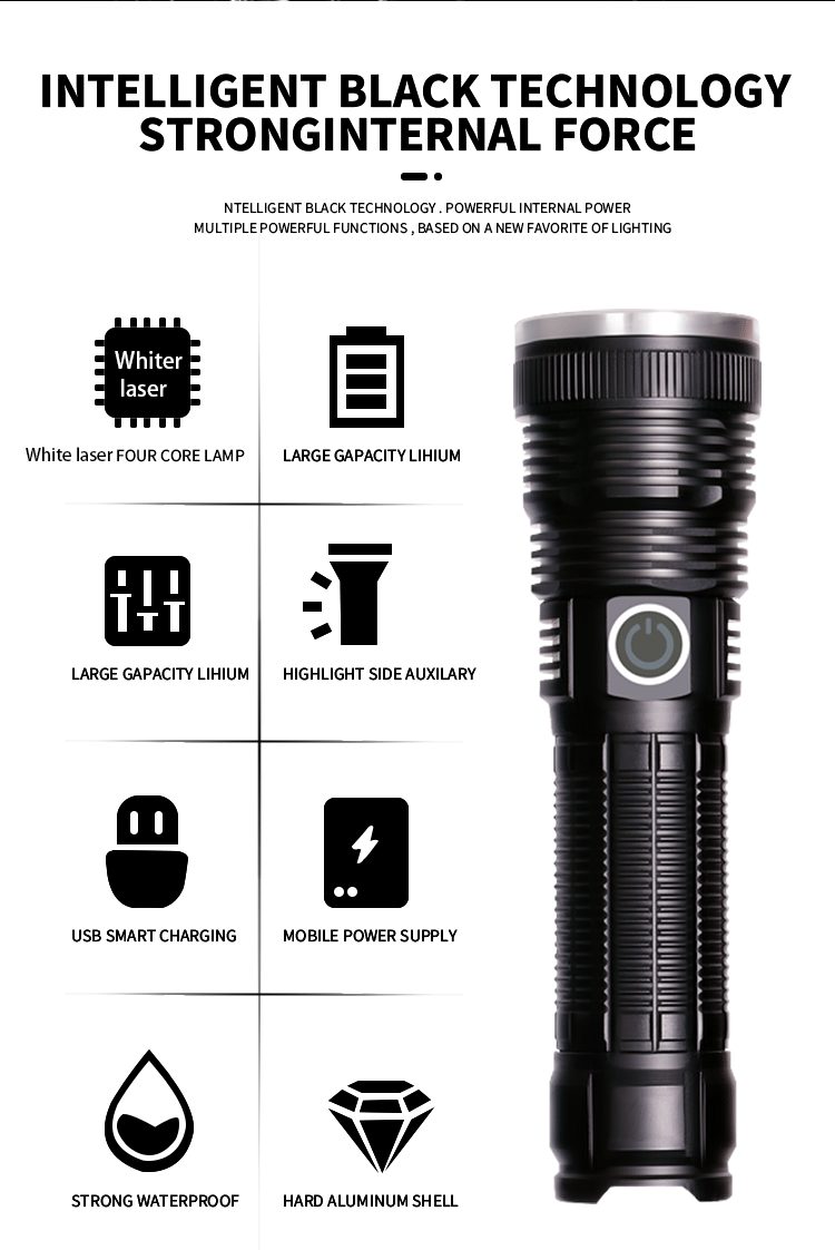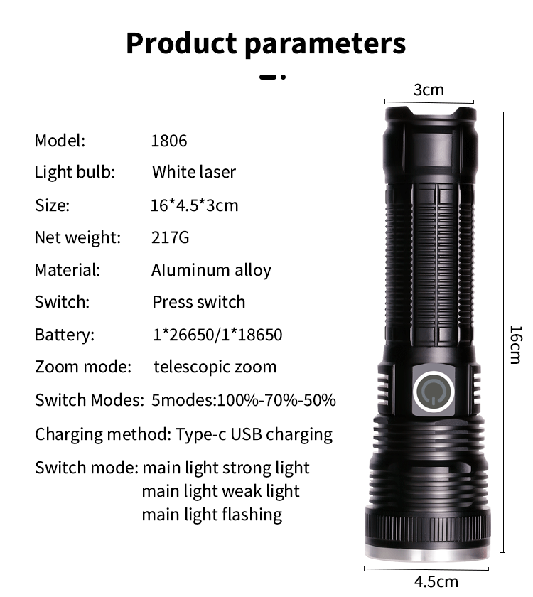 | Color | Láser blanco [linterna sin batería única] con cable de carga,Láser blanco [Batería 18650 + cable de carga + embalaje] 2600 mA,Láser blanco [Batería 26650 + cable de carga + embalaje] 5500 mA |