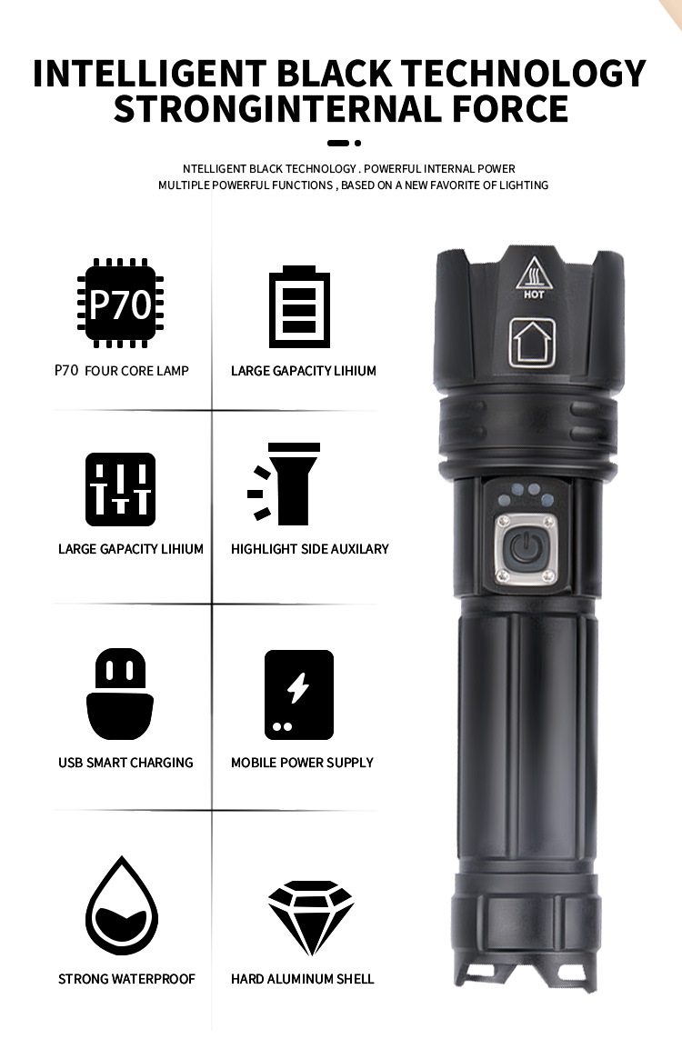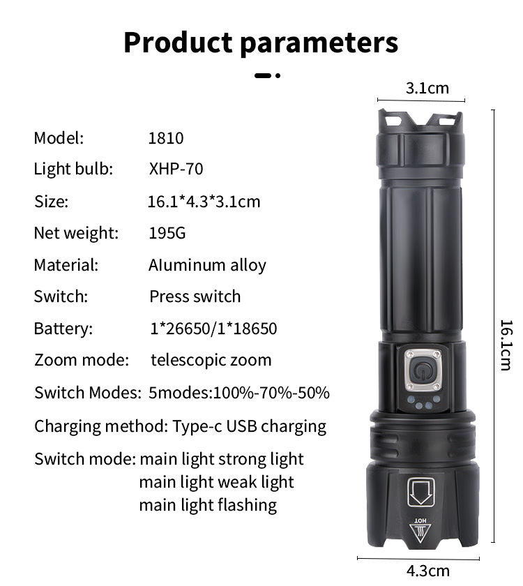 | Colores | P70 [linterna única sin batería],P70 [Embalaje del cable de carga de la batería 18650] 2600 mAh,P70 [Embalaje del cable de carga de la batería 26650] 5500 mAh |