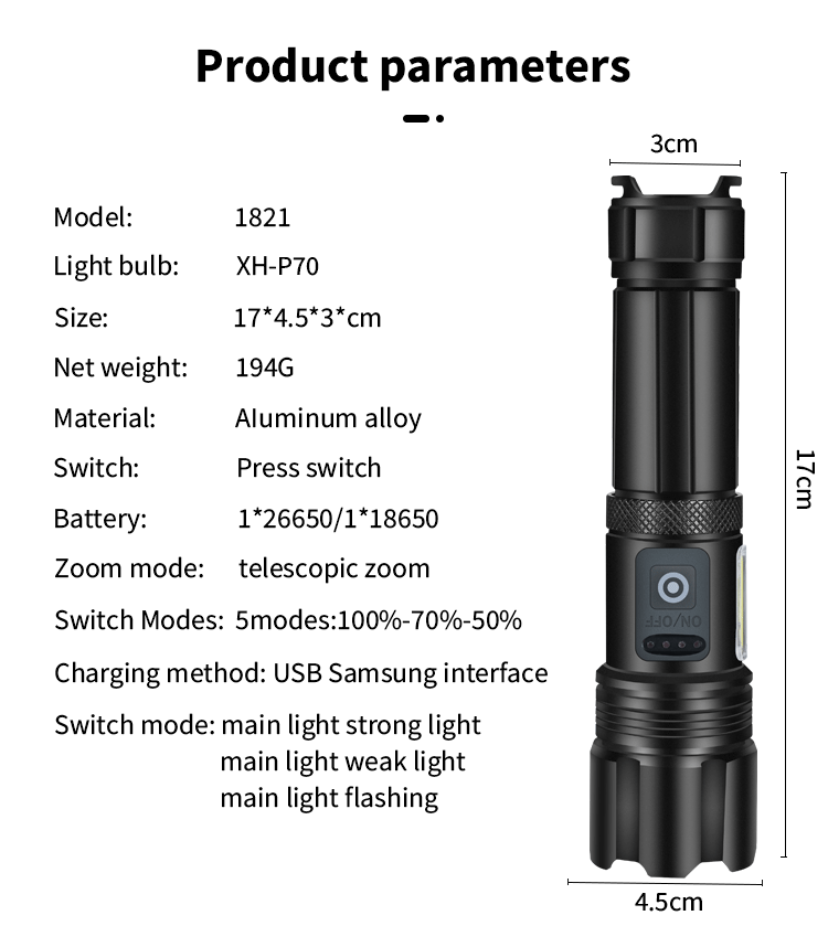 | Colores | P70 [linterna única sin batería] con cable de carga,P70 [Embalaje del cable de carga de la batería 18650] 2600 mAh,P70 [Embalaje del cable de carga de la batería 26650] 5500 mAh |