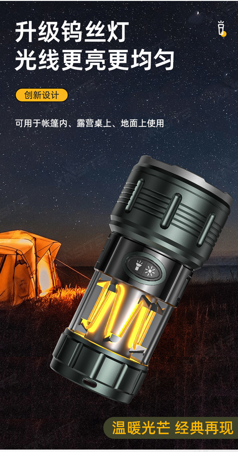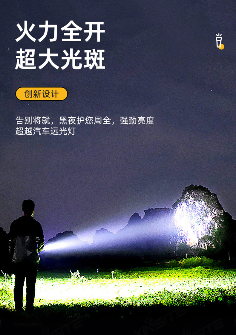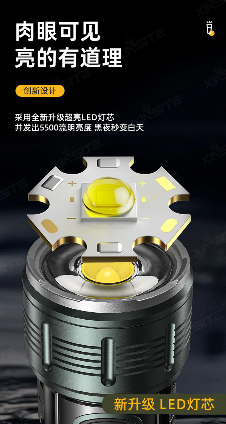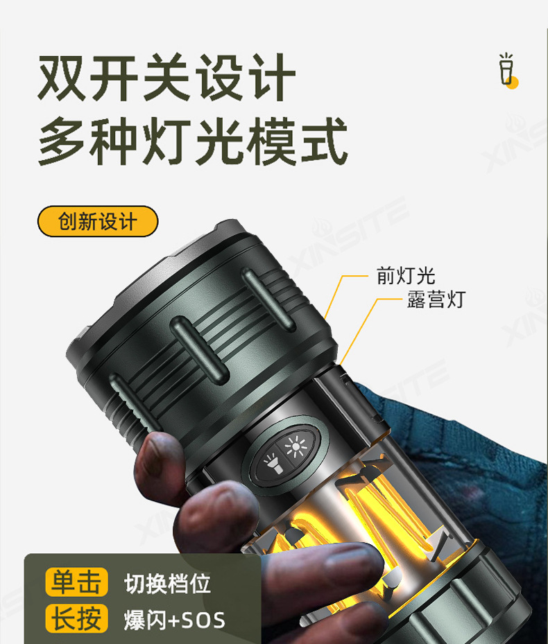 Nuevas linternas transfronterizas de alta luz al aire libre recargable portátil luz de búsqueda de pesca nocturna luz táctica de trabajo multifuncional