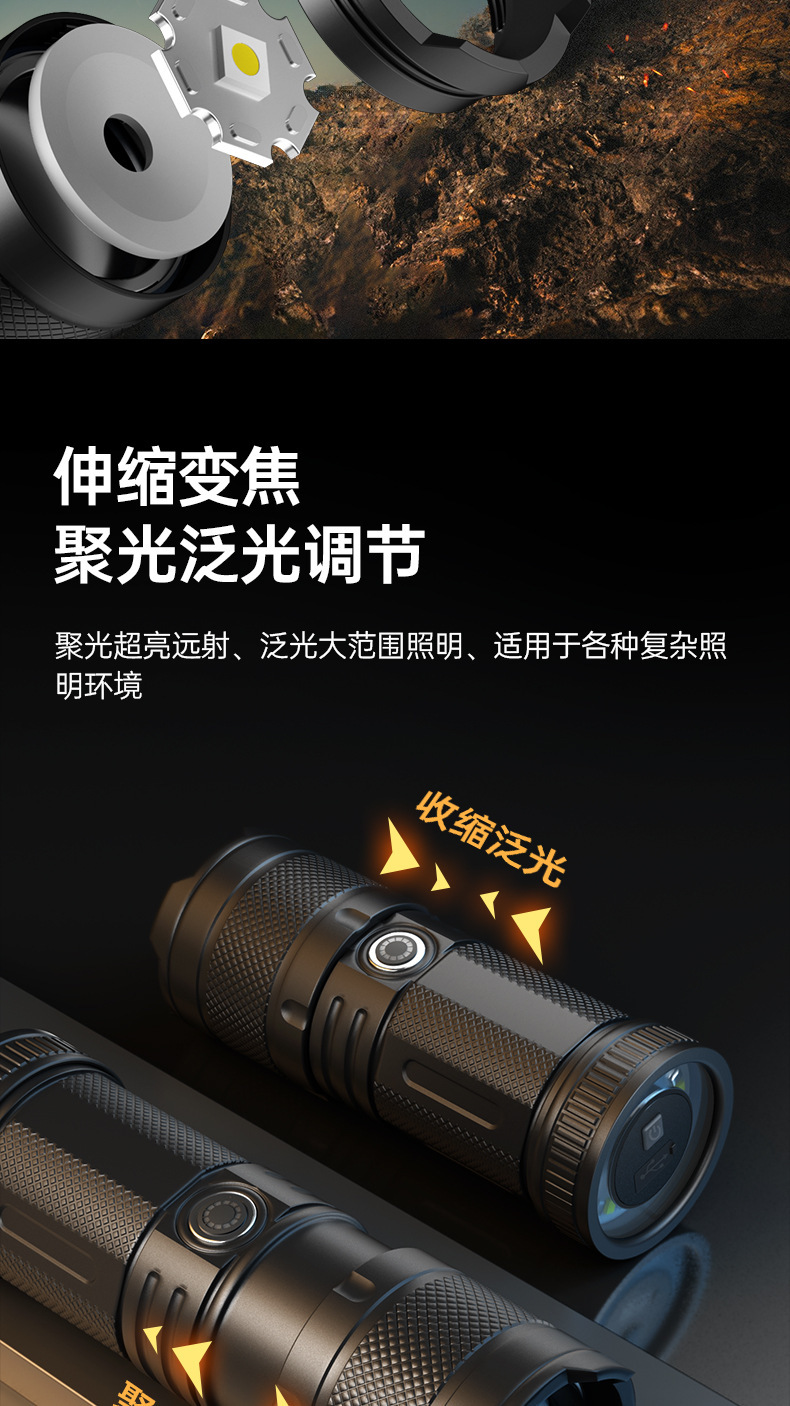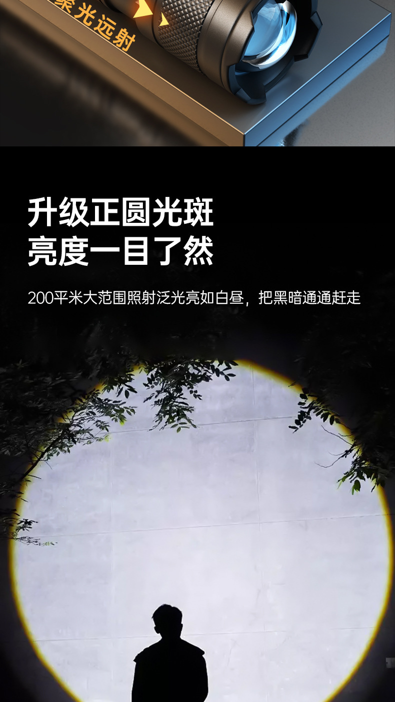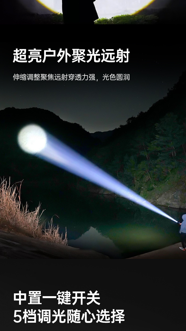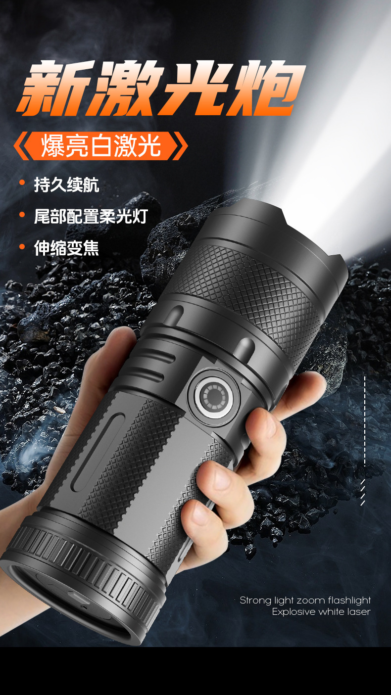 Nuevas linternas transfronterizas al aire libre multifuncional lámpara de iluminación de carga láser blanco resaltado antorcha portátil retráctil impermeable