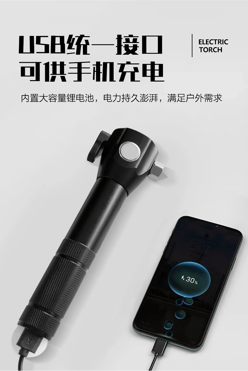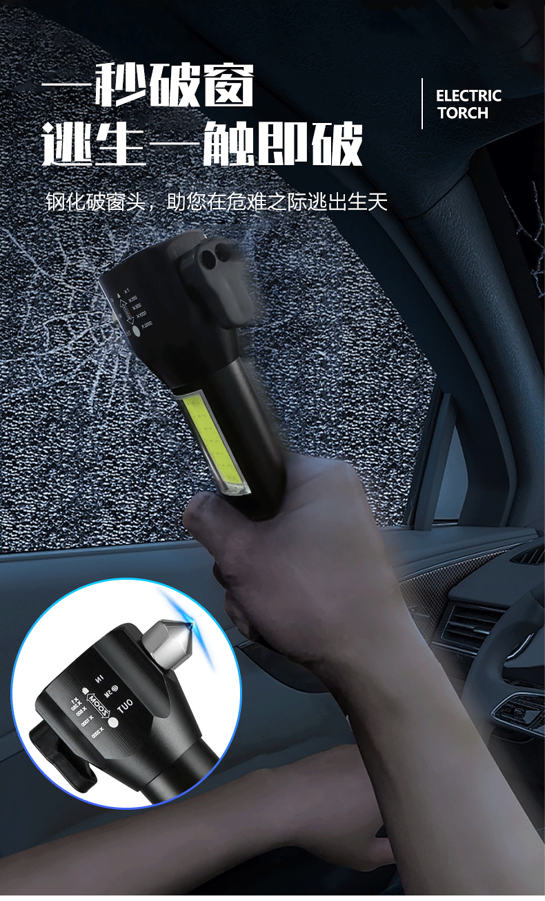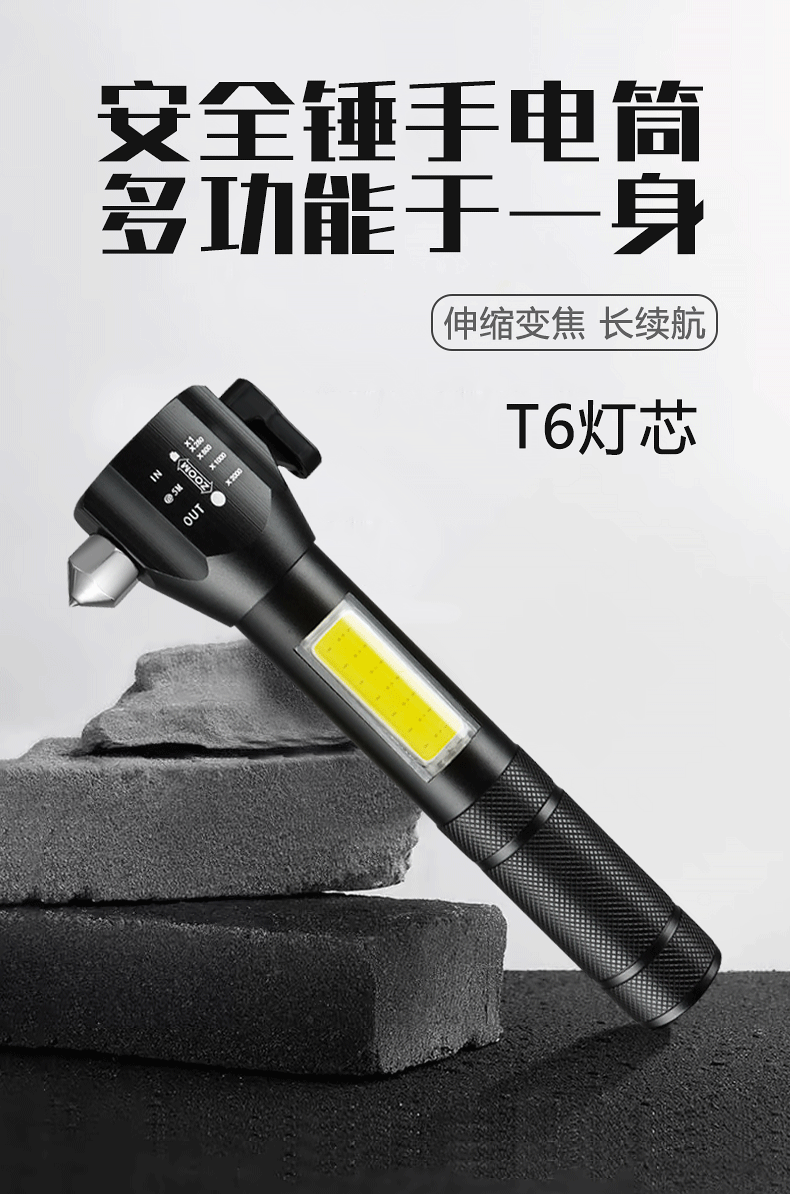 Martillo de seguridad transfronterizo, linterna de luz fuerte, coche multifuncional LED, rescate de incendios, martillo de escape, martillo de ventana rota, policía al aire libre