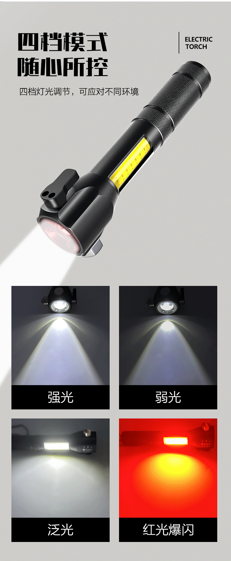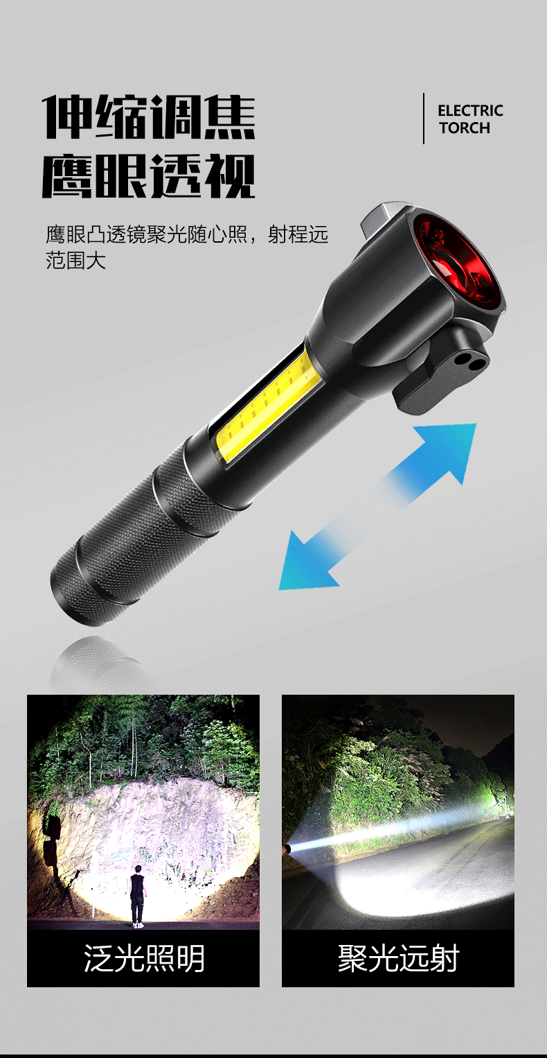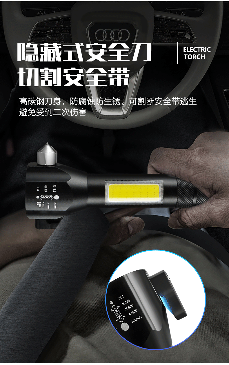 Martillo de seguridad transfronterizo, linterna de luz fuerte, coche multifuncional LED, rescate de incendios, martillo de escape, martillo de ventana rota, policía al aire libre