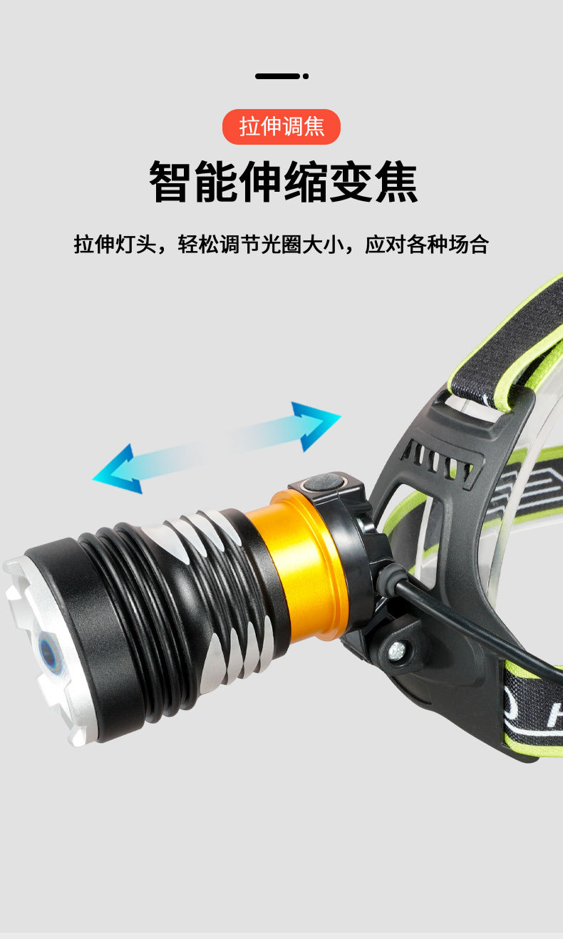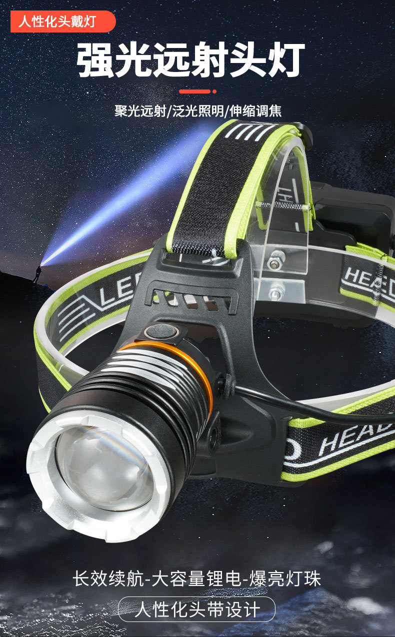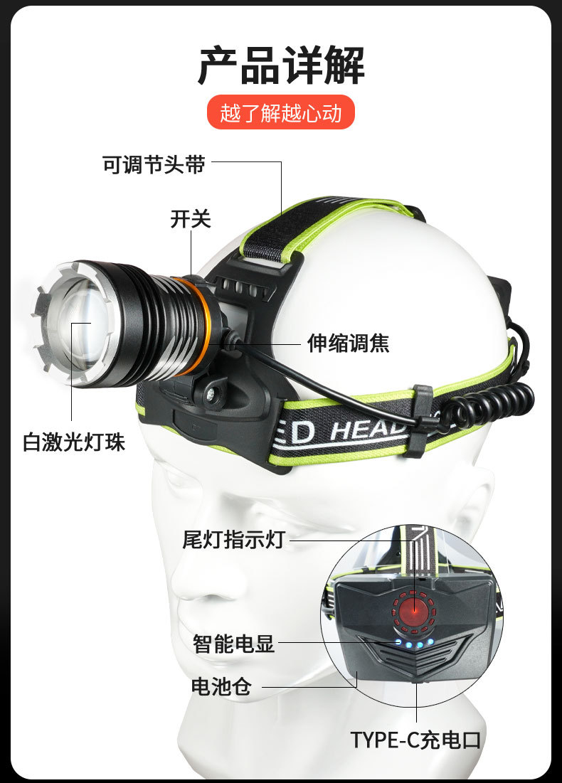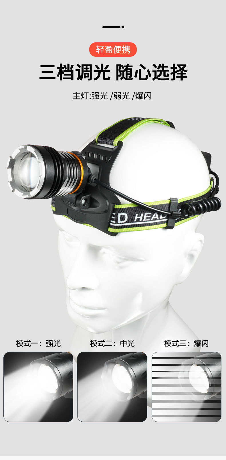 Faros al aire libre transfronterizos larga duración batería de litio láser blanco de aleación de aluminio telescópico enfoque led auricular luz de pesca nocturna