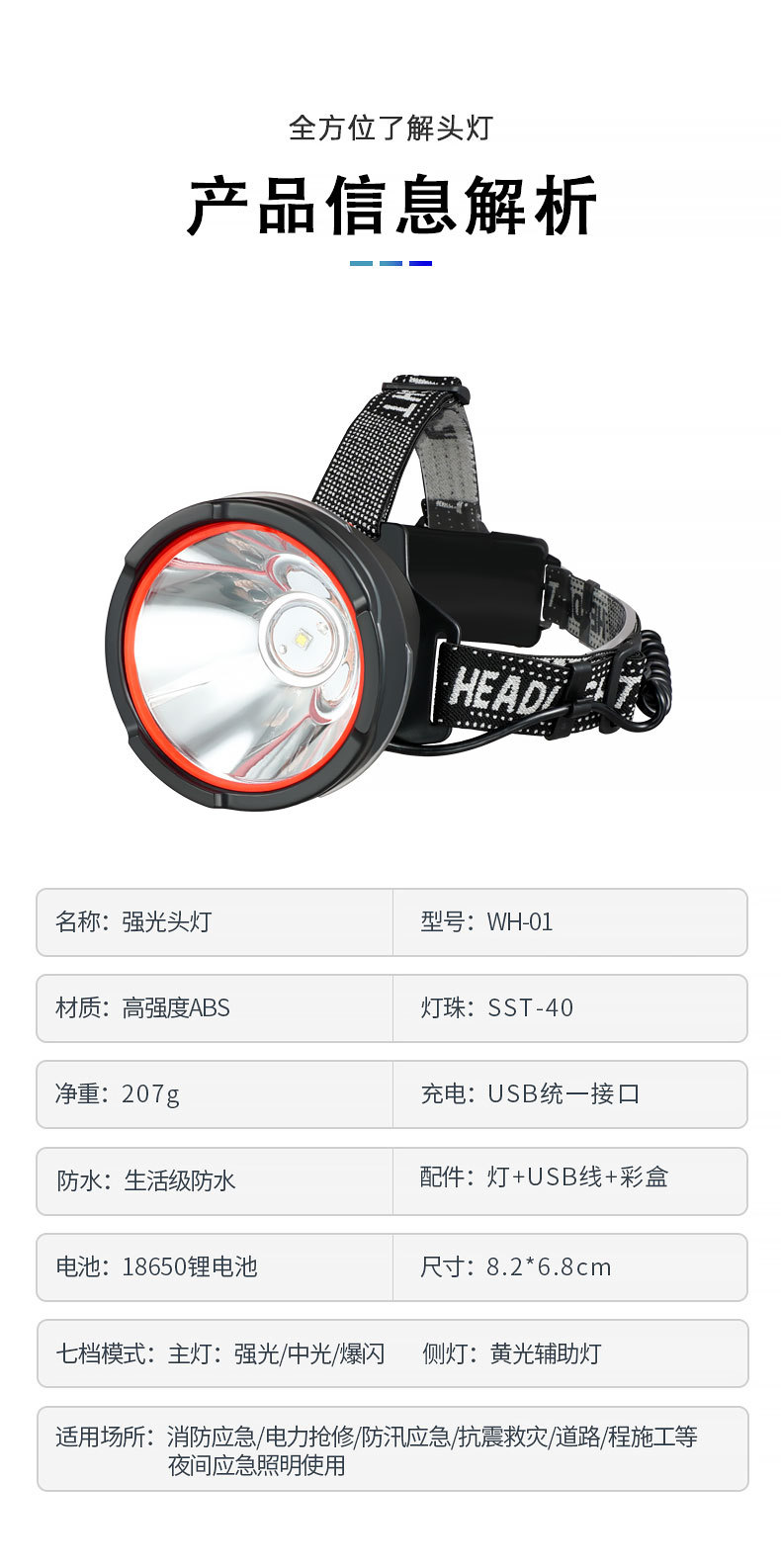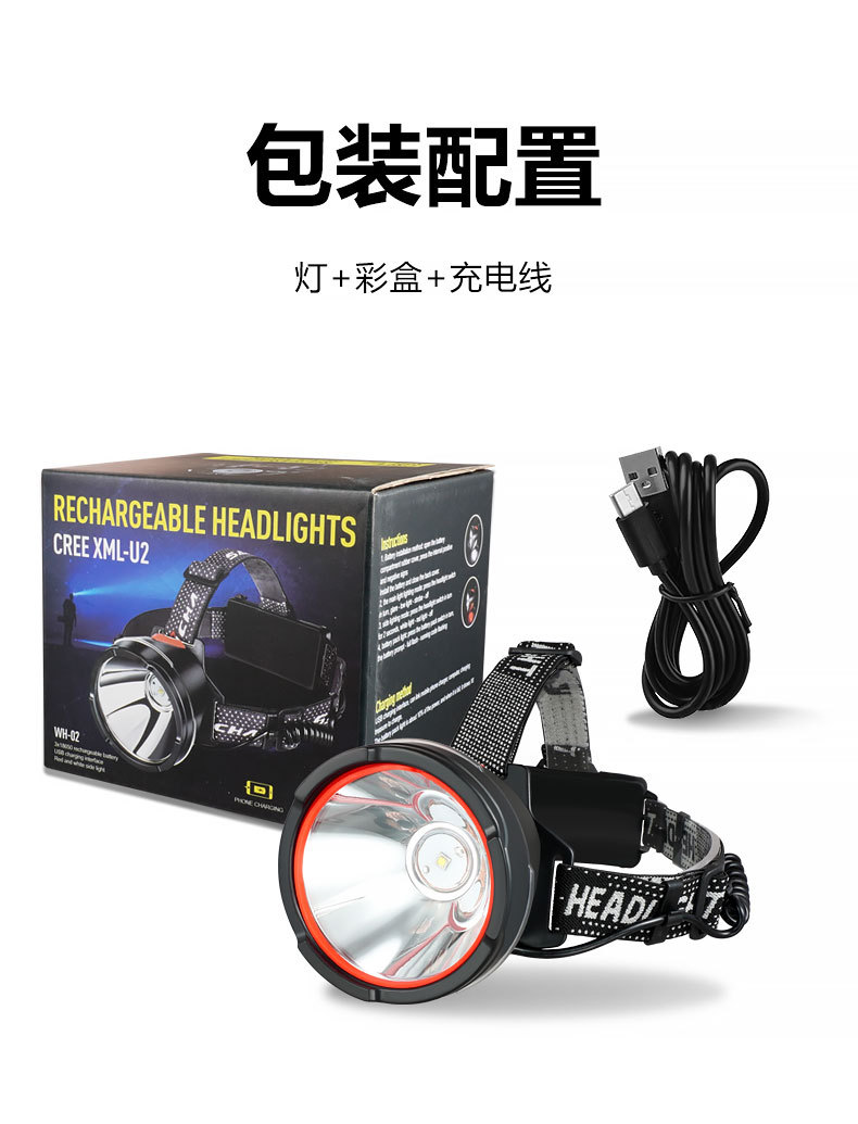 WH-01 multi-función faro + cable de carga USB + caja de color