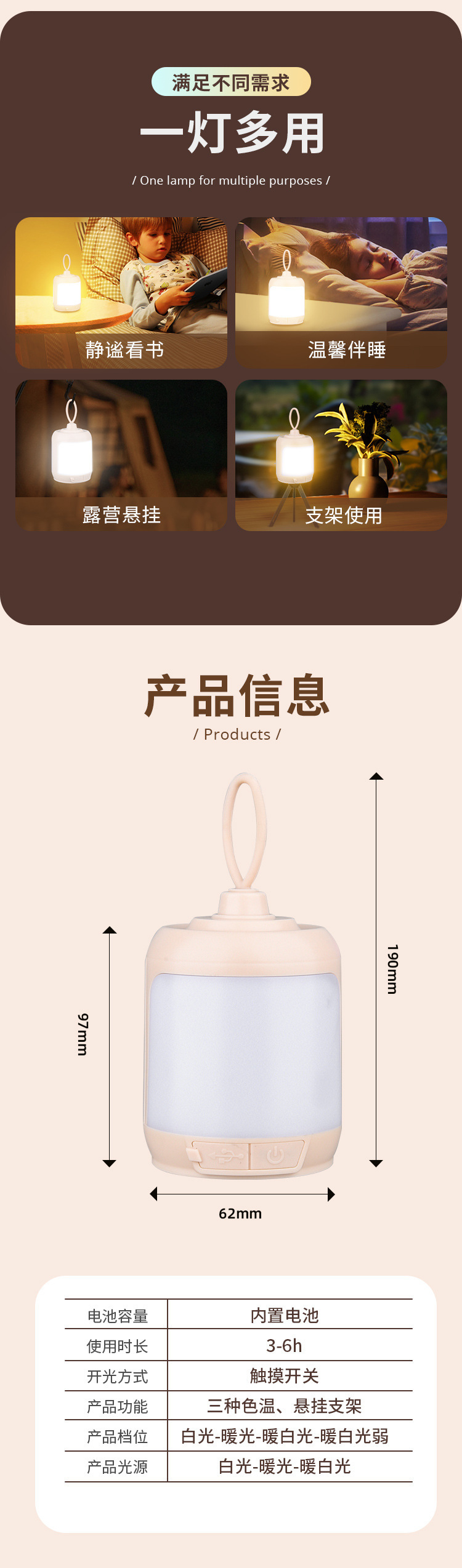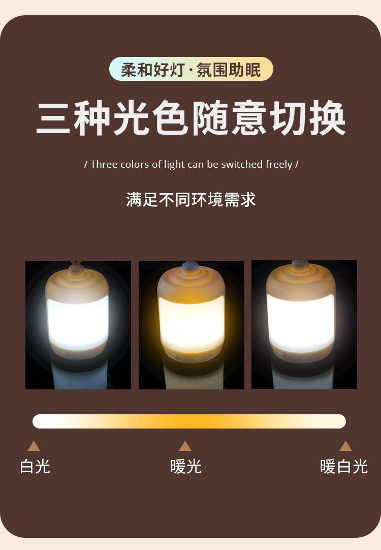 Luz portátil inalámbrica transfronteriza al aire libre luz nocturna ambiente de camping bicolor recargable camping portátil LED luz nocturna