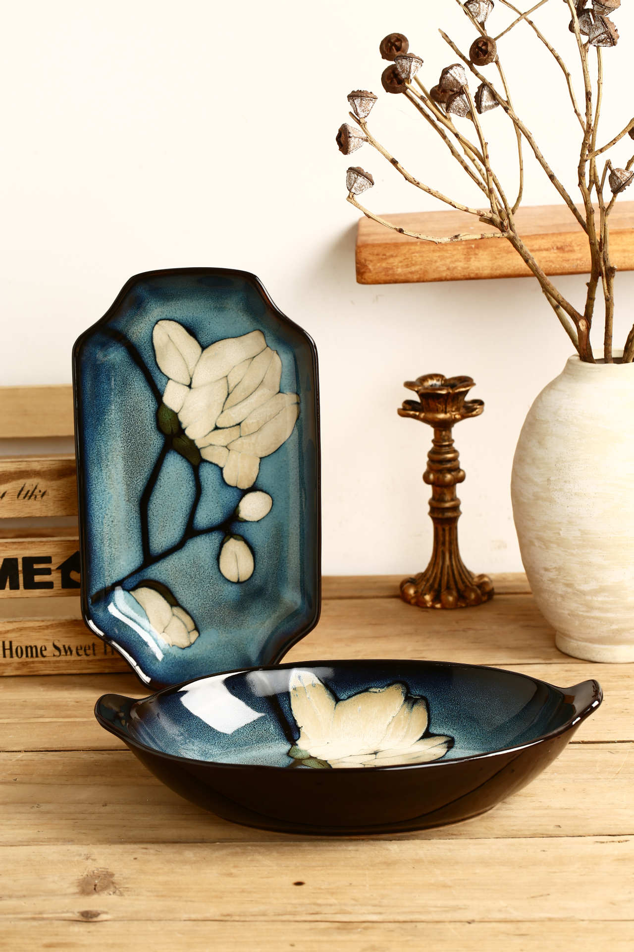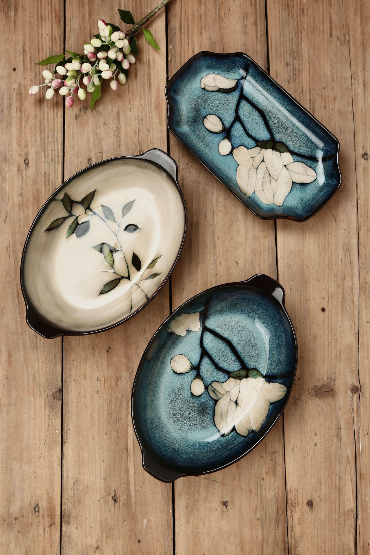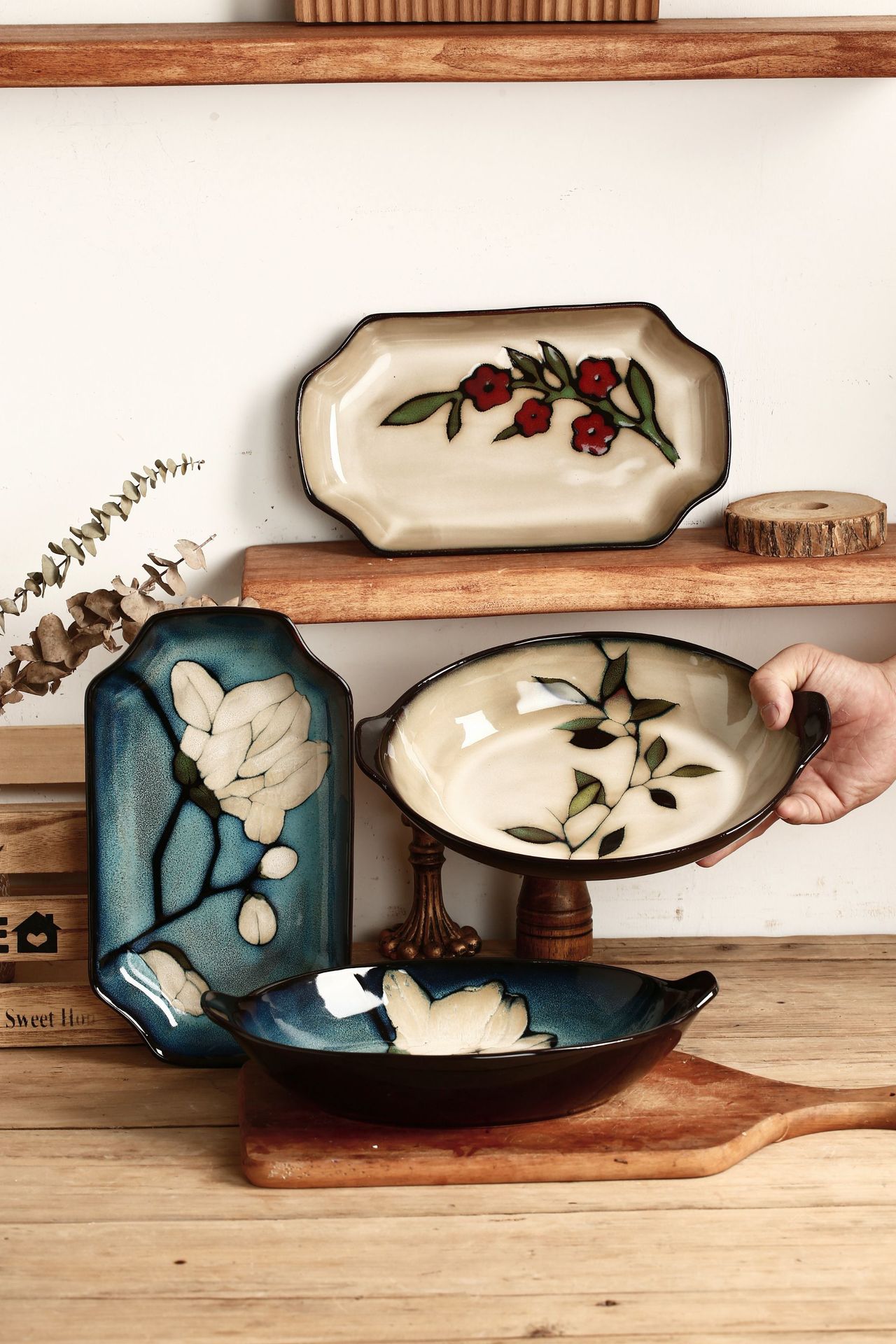Flor pintada a mano de cerámica plato de pescado grande horno cambio creativo Placa de doble oreja hogar plato profundo bajo vidriado color a juego plato de sushi grande