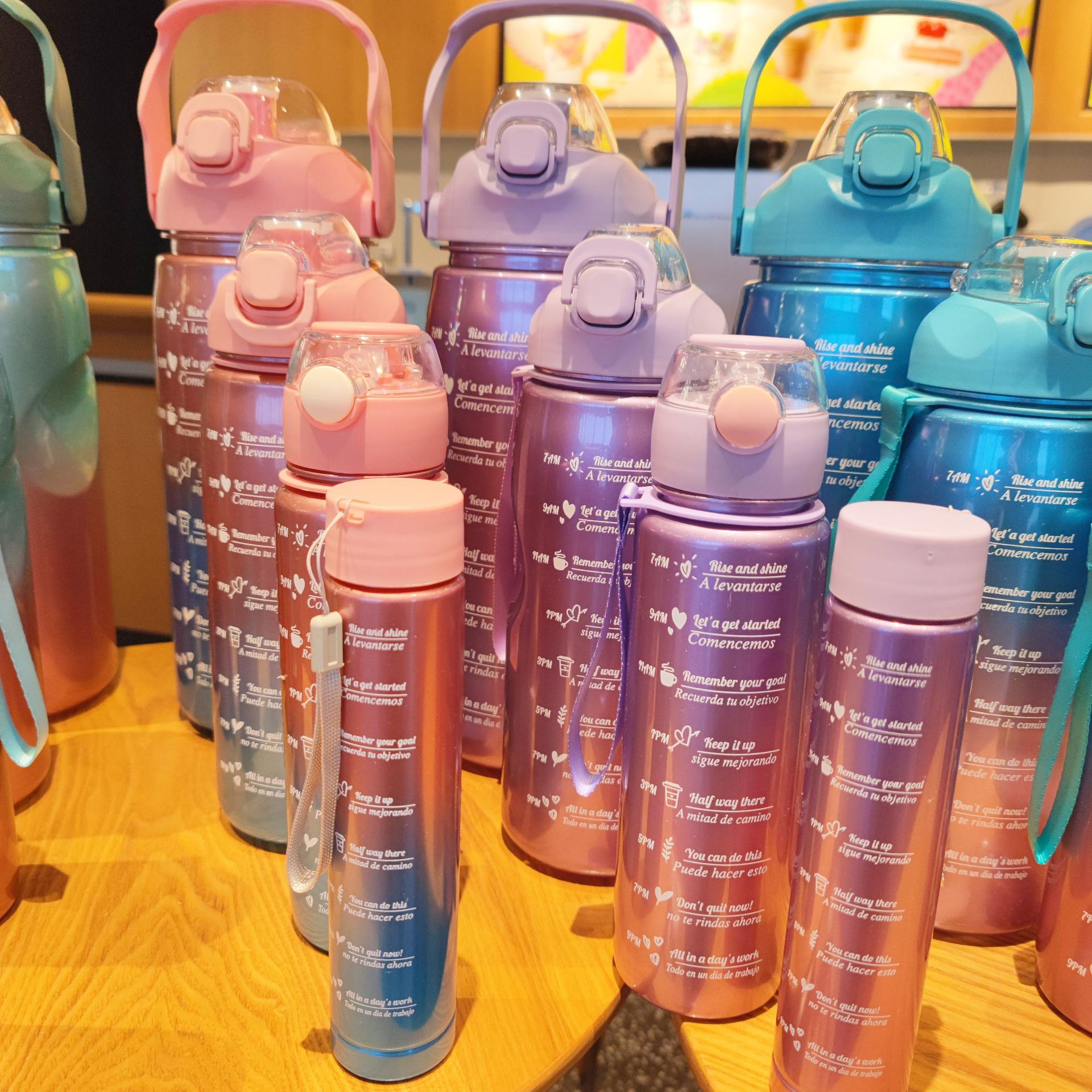 Resalte gradiente de color plástico paja taza de agua de cuatro piezas conjunto de gran capacidad de fitness deportes hervidor de agua mango portátil botella de agua
