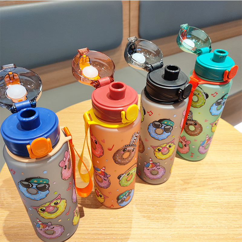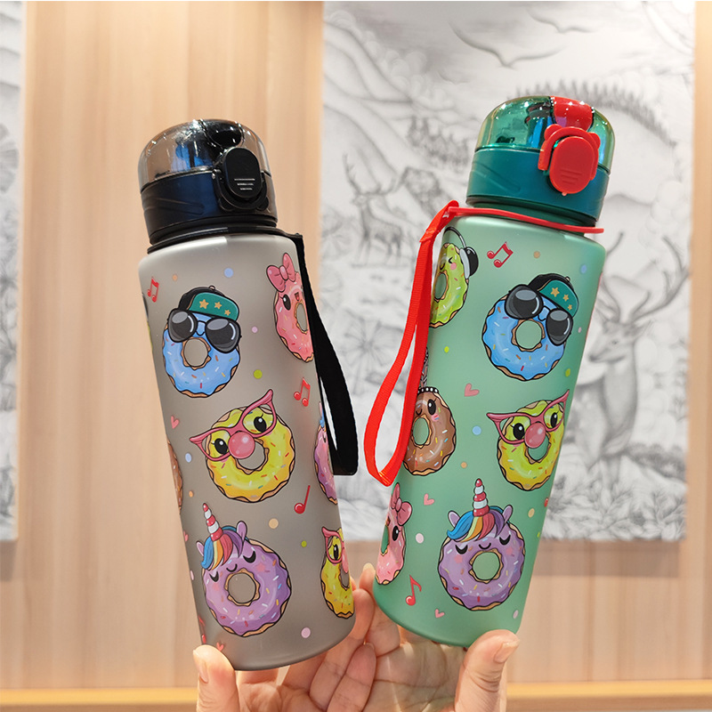 Nuevo patrón de dibujos animados taza de plástico esmerilado conveniente portátil taza de agua de donut cerradura tapa rebote taza de mochila de bebida directa