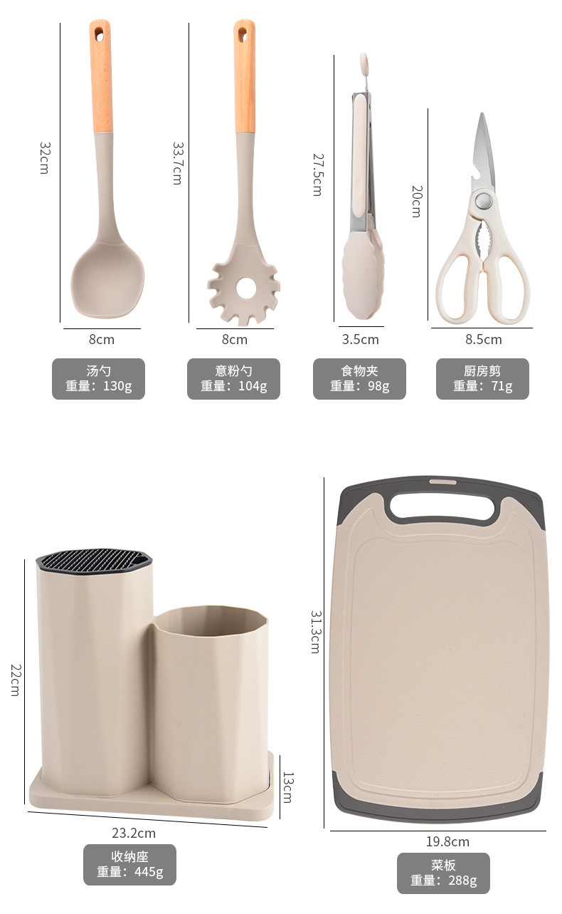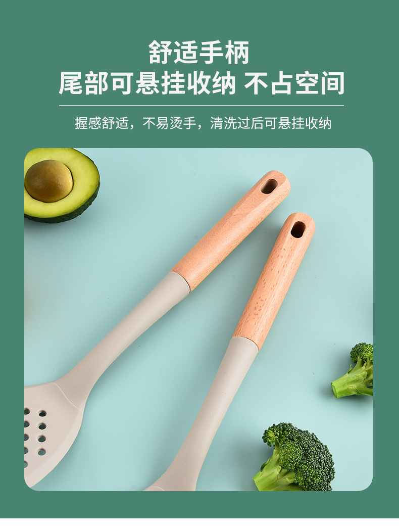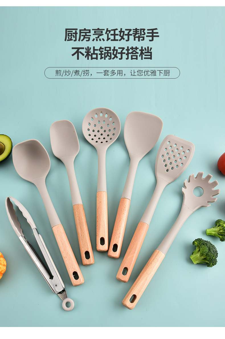 Cuerpos de cocina de silicona de mango de madera 15 piezas de cocina antiadherente cocina de cocina de barril de almacenamiento 15 piezas de cocina de silicona