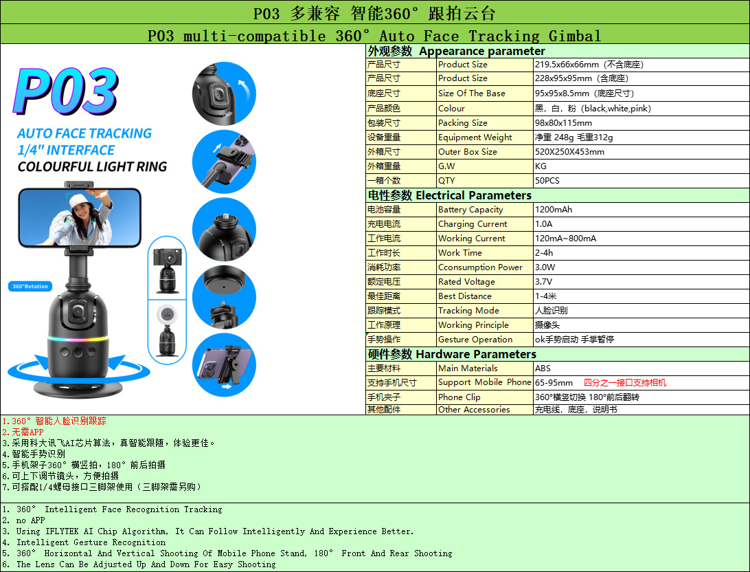 Estabilizador inteligente de escritorio P03 para teléfono móvil, 360° seguimiento facial, antivibración, ideal para transmisiones en vivo