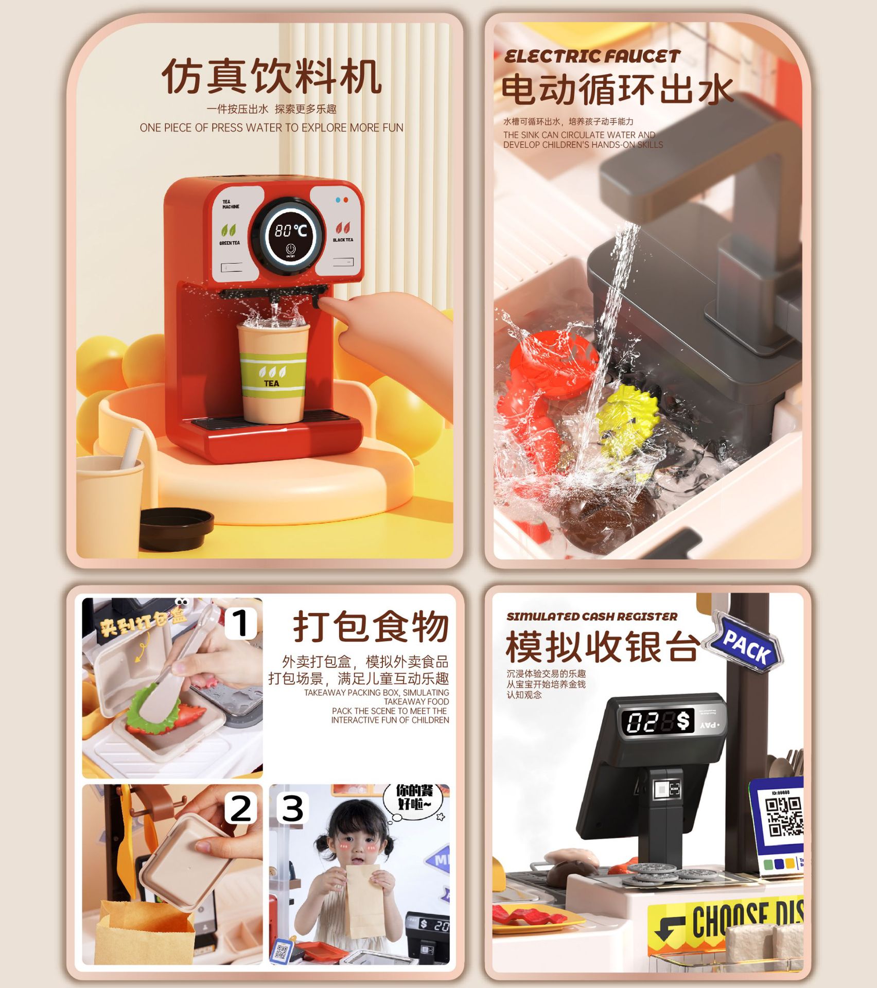 Niños transfronterizos en casa simulación pulverización eléctrica correa de agua acústica y luz de cambio de color comida rápida conjunto de carrito al por mayor