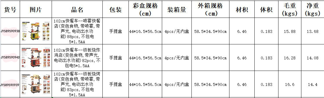 | Color | Jy589590938 restaurante de comida rápida en aerosol [alimentos decolorados / sonido y luz / agua] una caja pesa 3,42 kg, jy589590940 restaurante de pollo frito con placa de hierro [alimentos decolorados / sonido y luz / agua] una caja pesa 3,52 kg, jy589590939 restaurante de barbacoa con placa de hierro [alimentos decolorados / sonido y luz / agua] una caja pesa 3,6 kg |