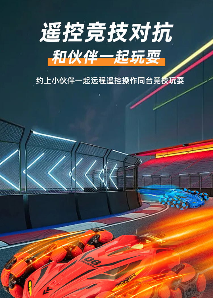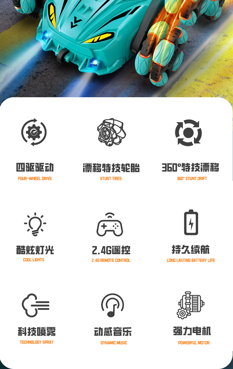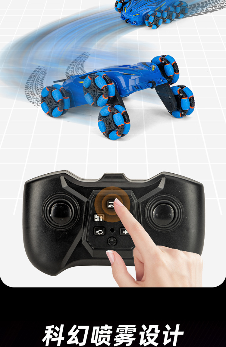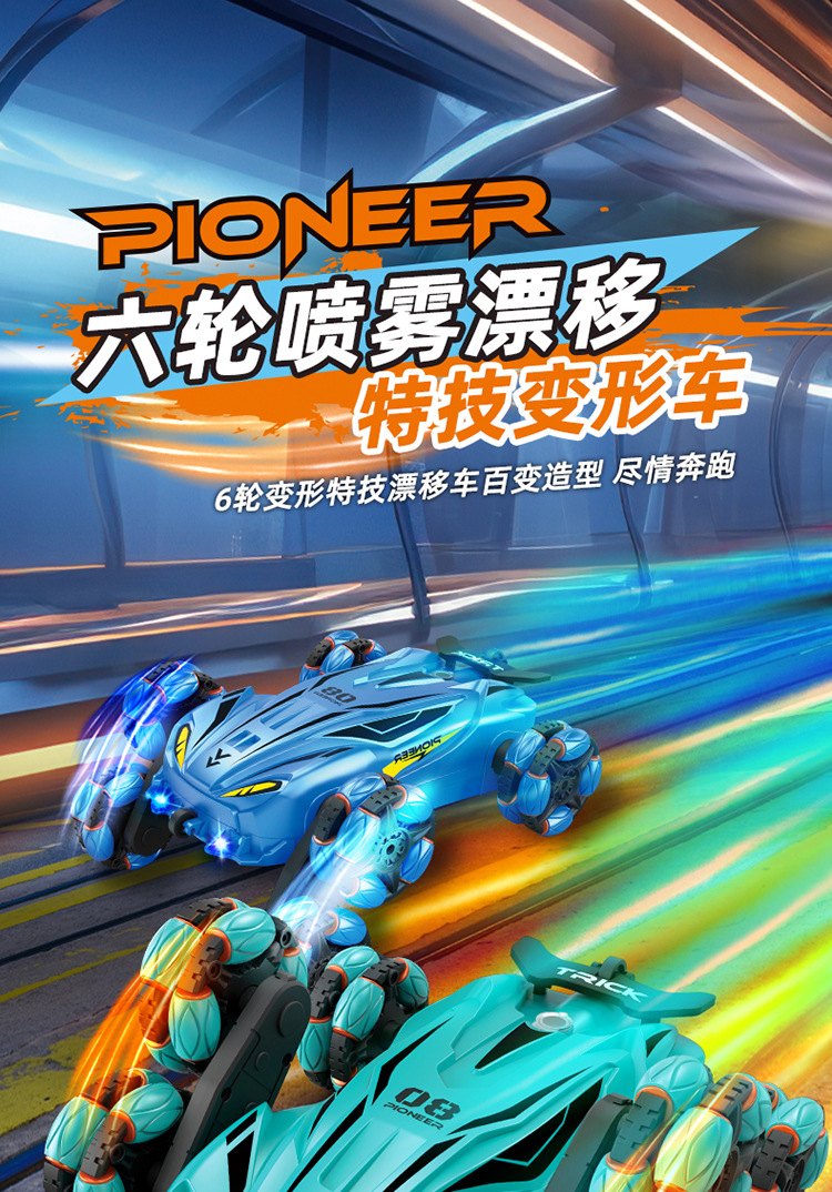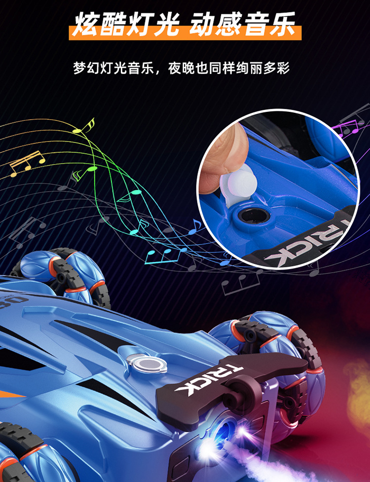 Nuevos productos transfronterizos spray drift truco coche de control remoto música de color brillante iluminación de seis ruedas de control remoto coche de deformación juguetes para niños