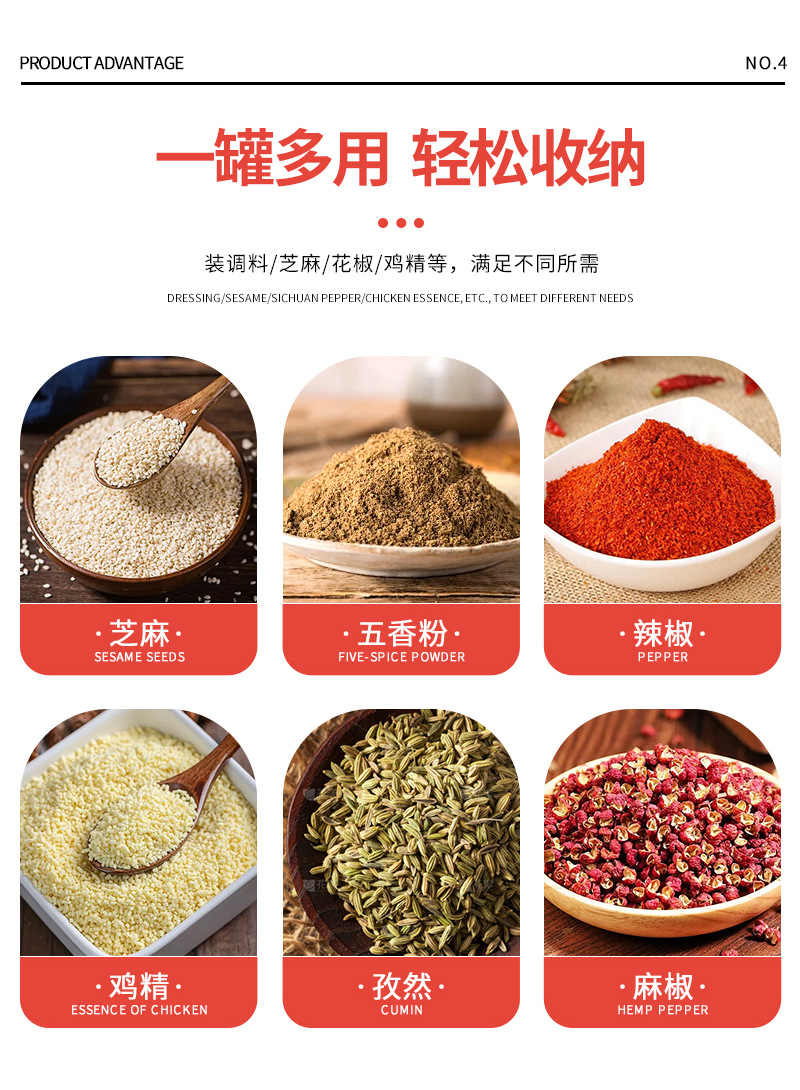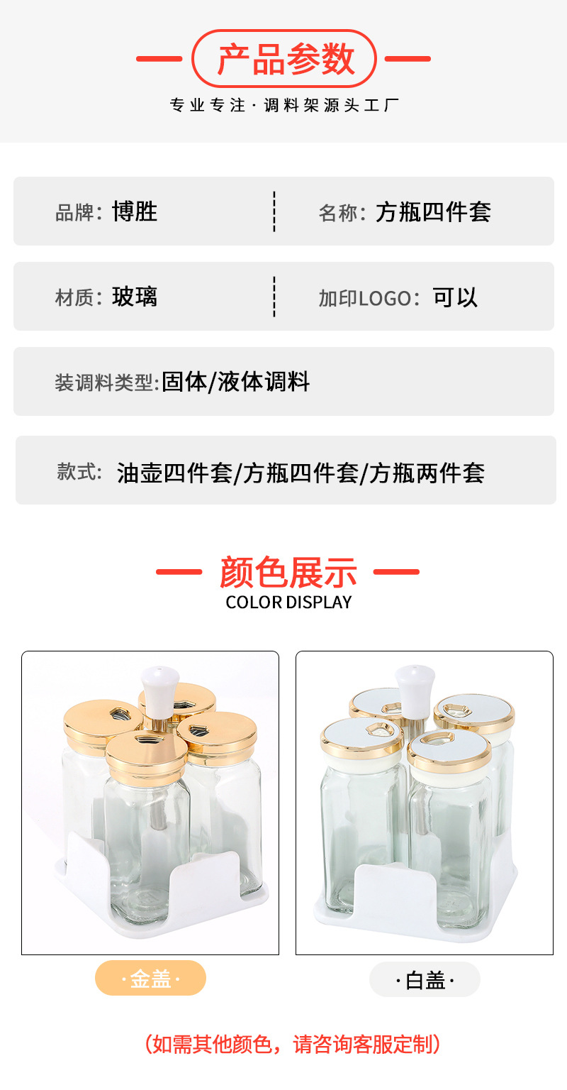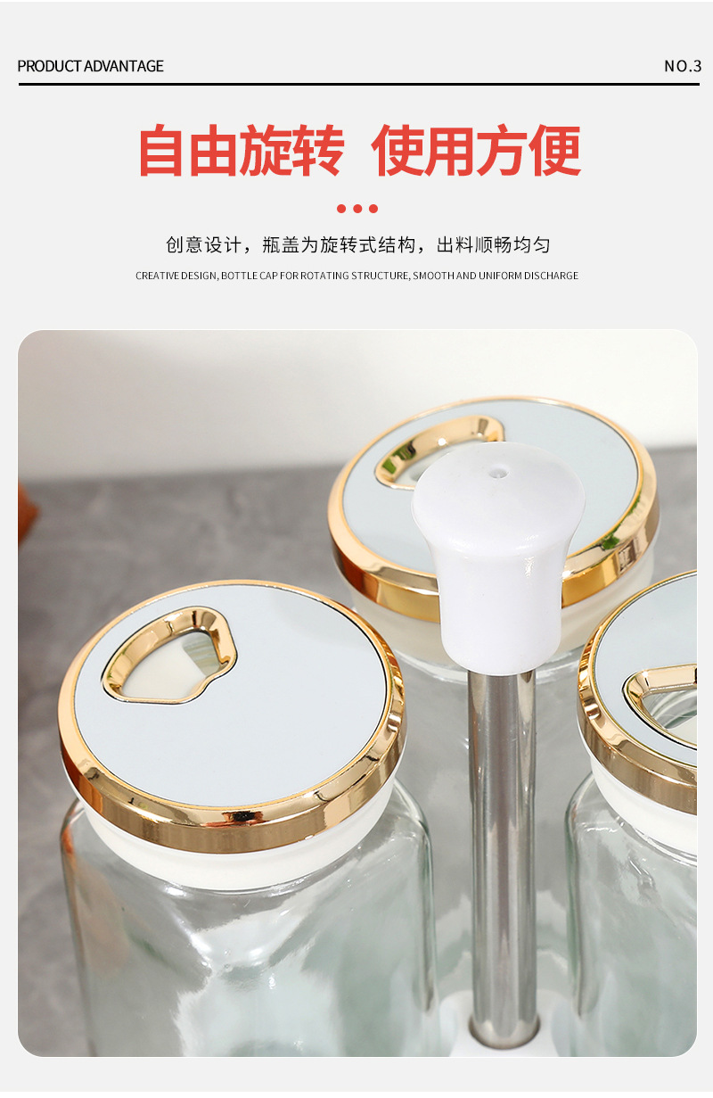 Botella cuadrada de lujo ligera de cuatro piezas Botella de condimento de vidrio de cocina Olla de aceite Tanque de sal a prueba de humedad Tarro de condimento Botella giratoria