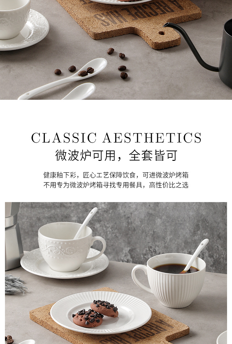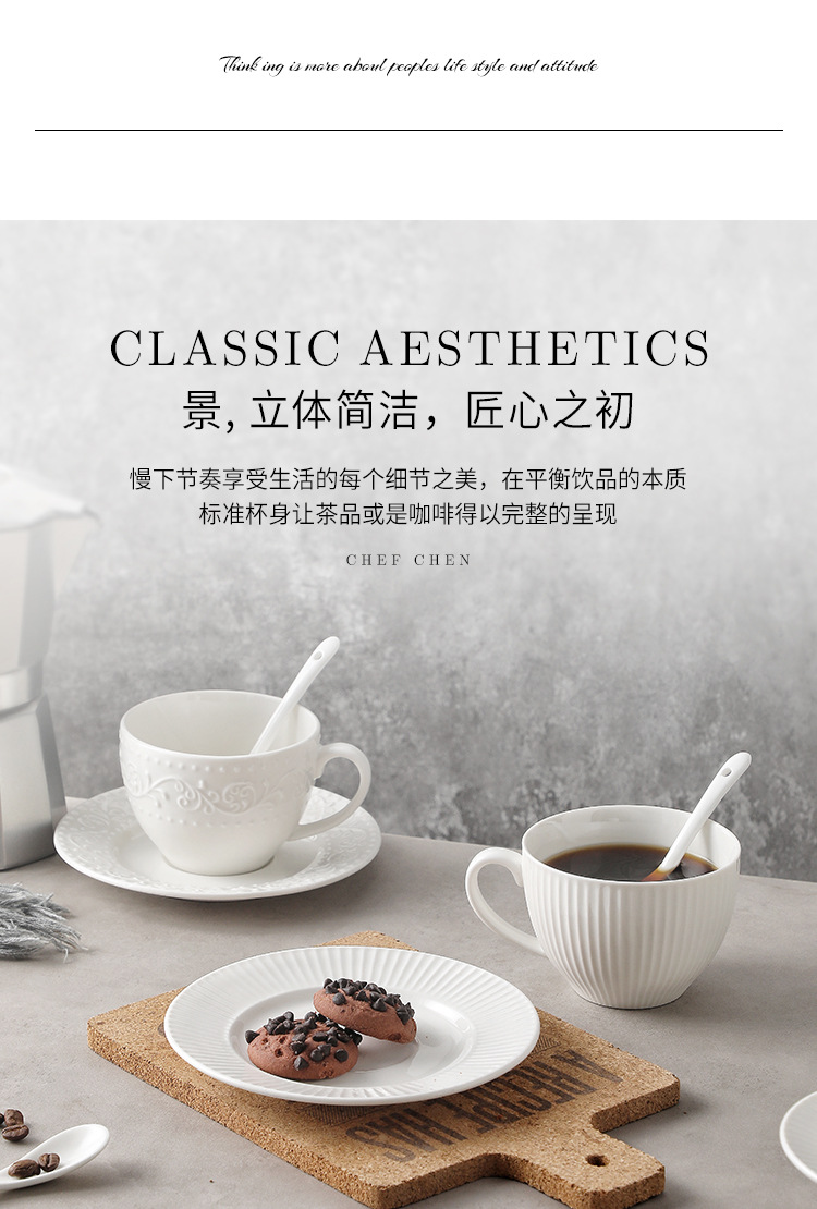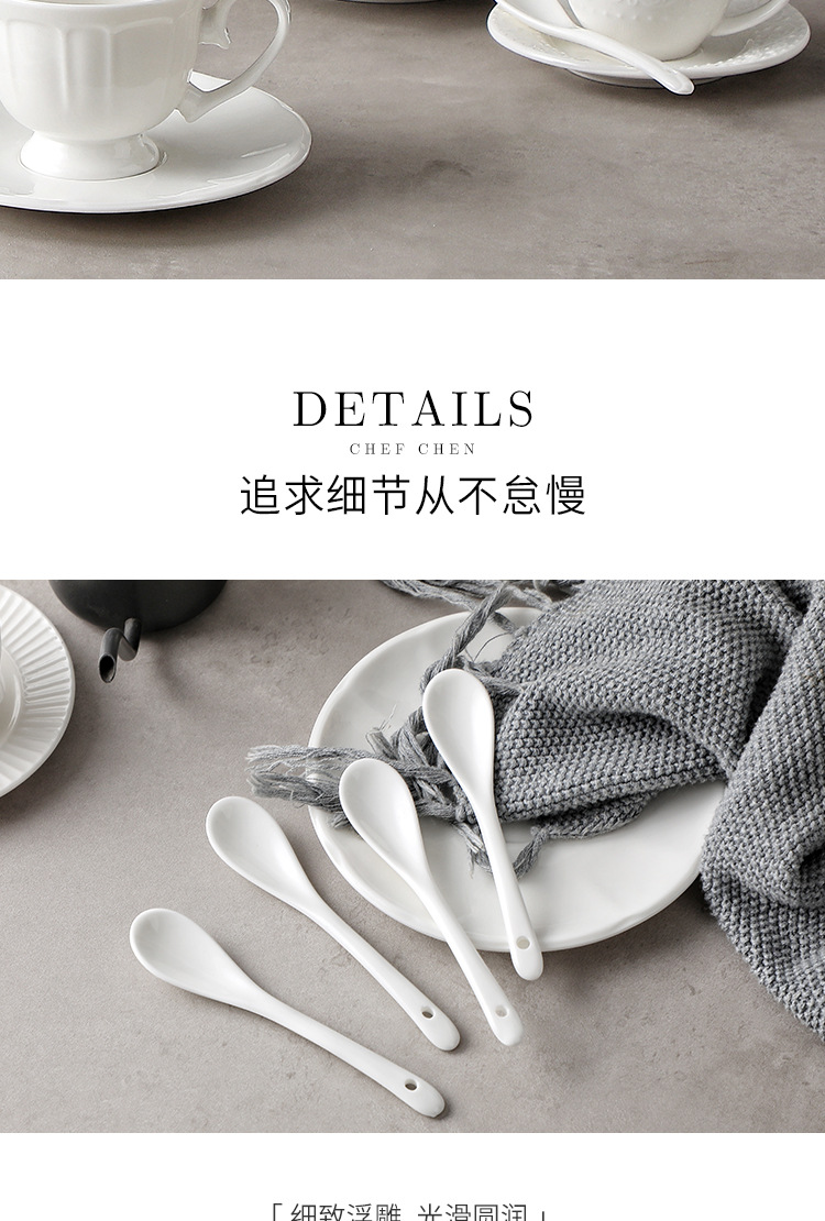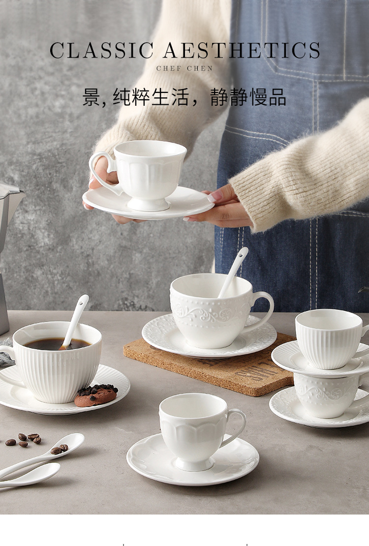 Juego de tazas y cucharas de café en relieve de cerámica blanca pura, tazas de alto valor, vajilla de postre de té de la tarde de estilo europeo