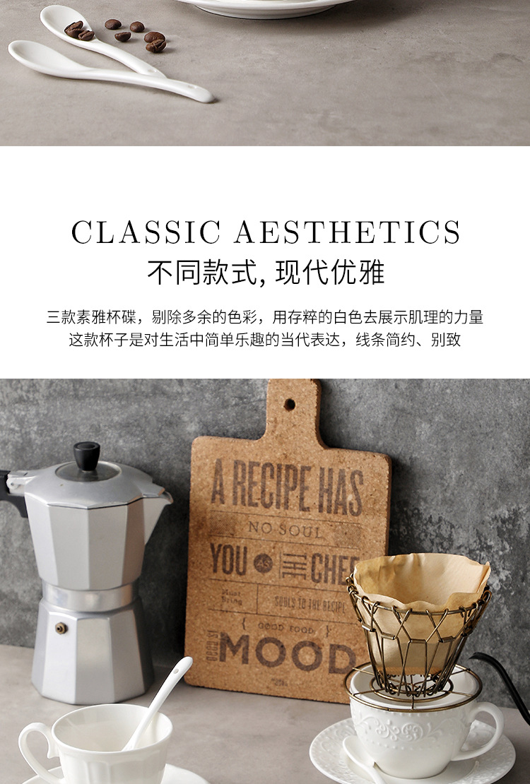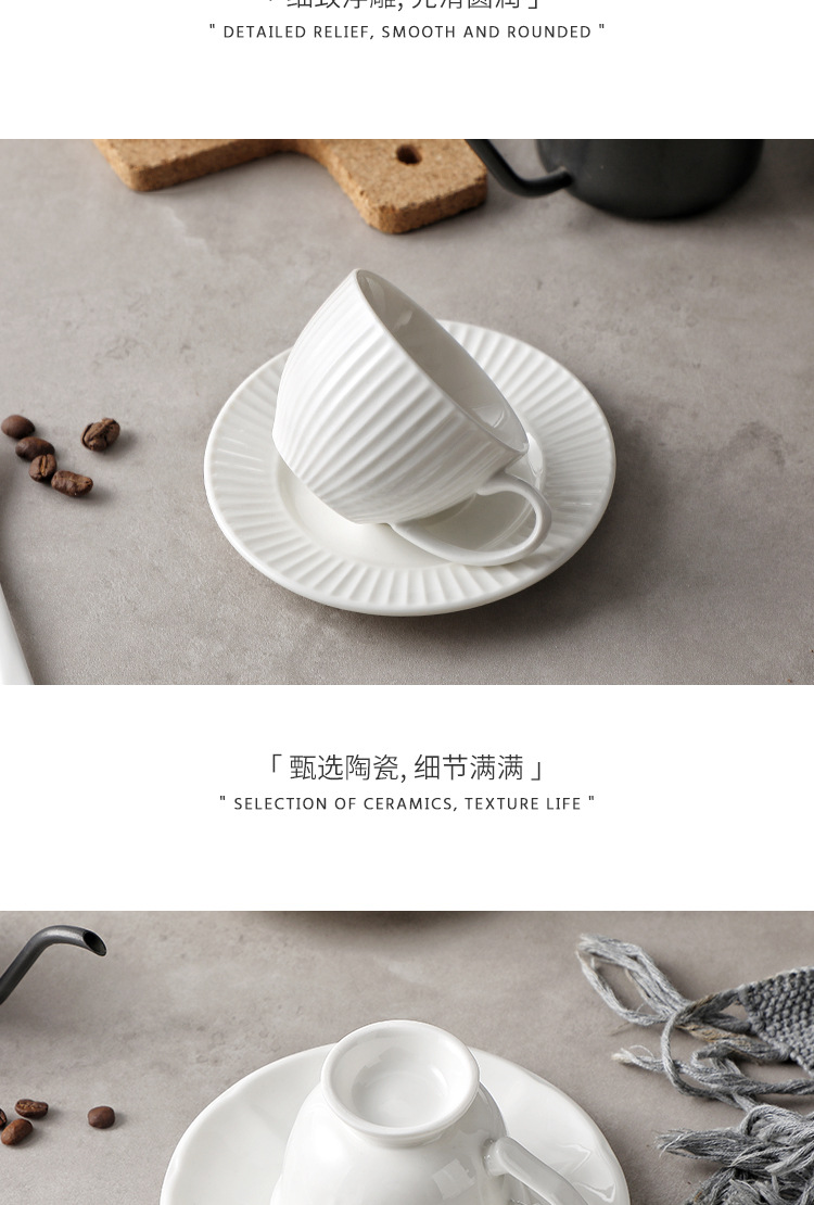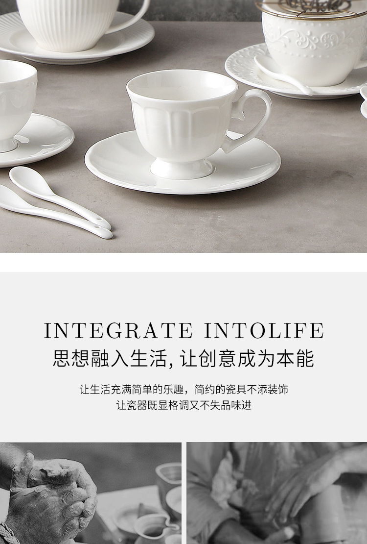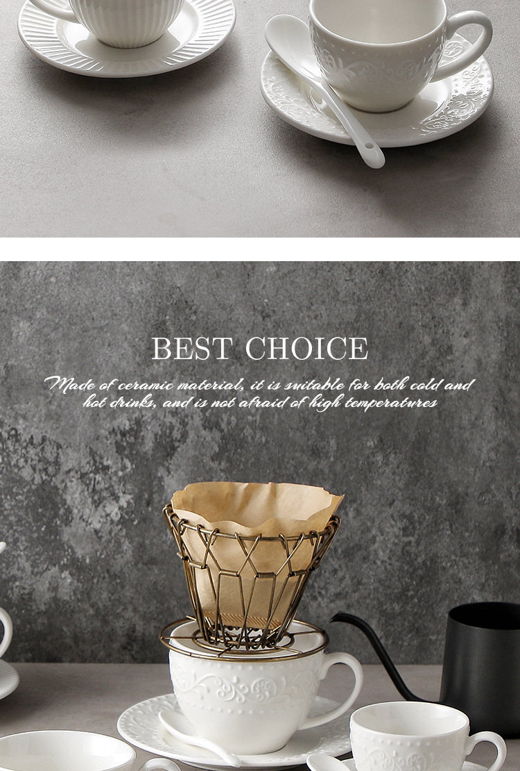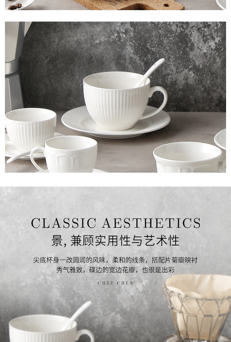 Juego de tazas y cucharas de café en relieve de cerámica blanca pura, tazas de alto valor, vajilla de postre de té de la tarde de estilo europeo