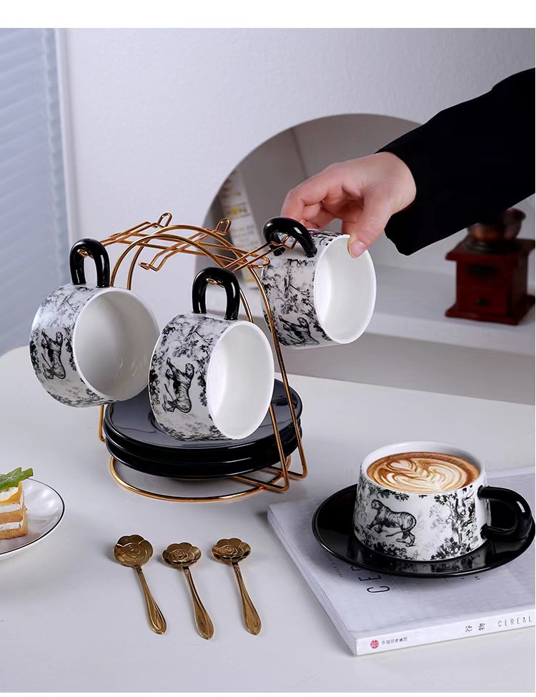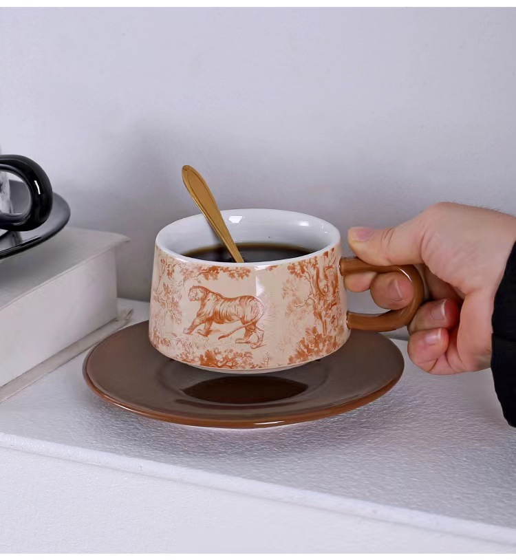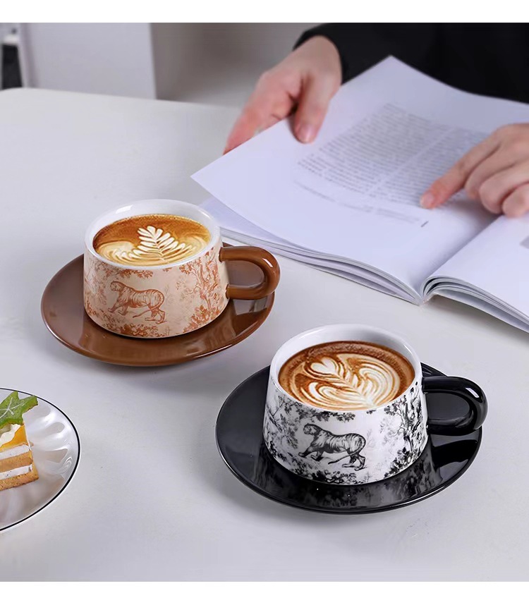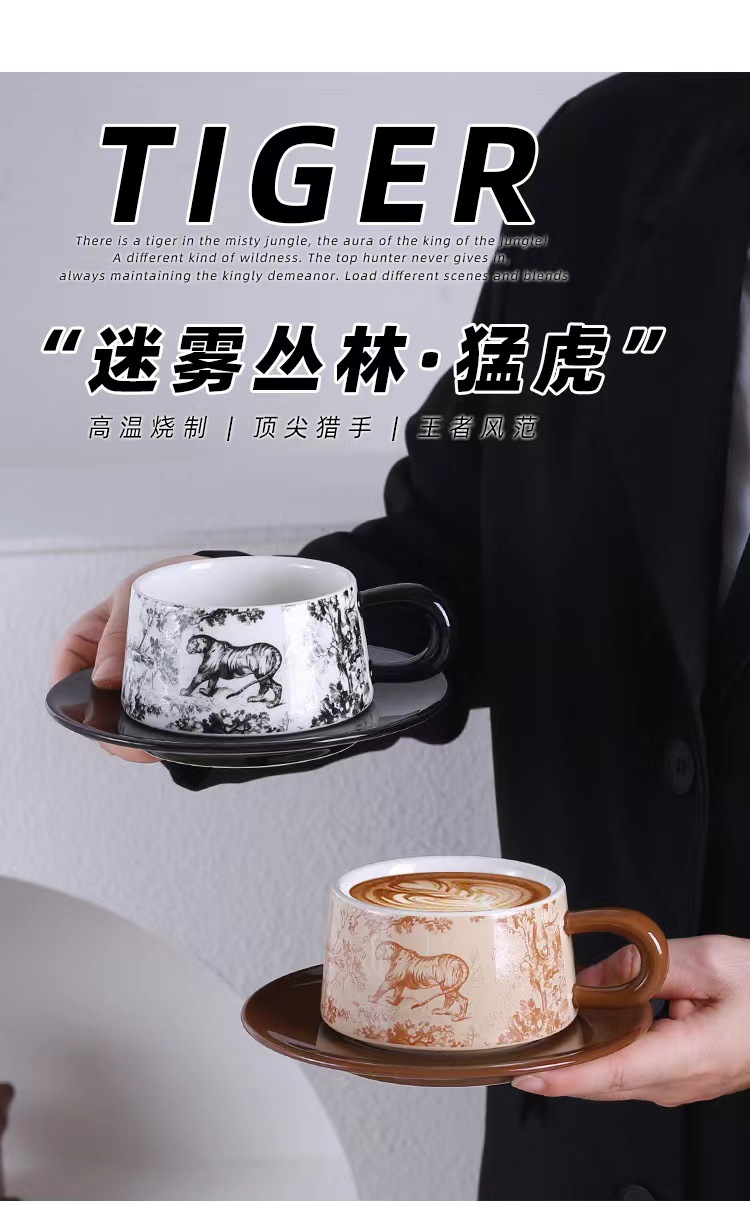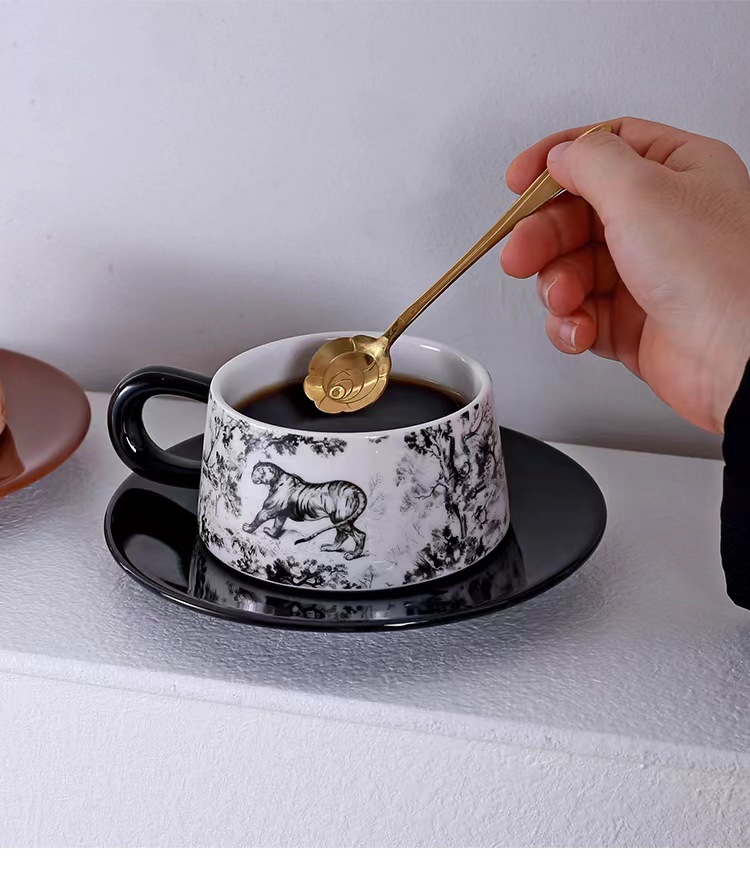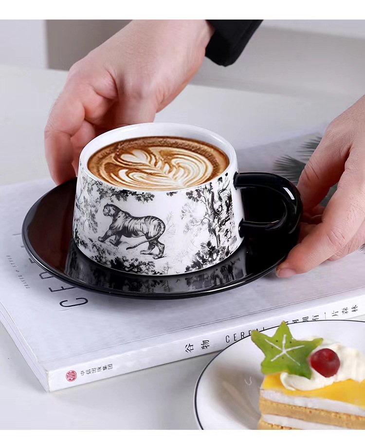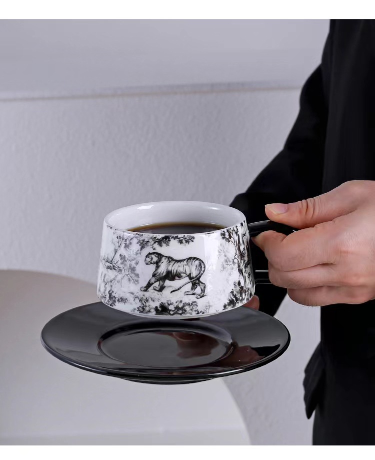 Tazas y platillos retro franceses de alto valor de la cara tigre y dragón con tazas de café con tazas de cerámica negra exquisita taza de menú de la tarde