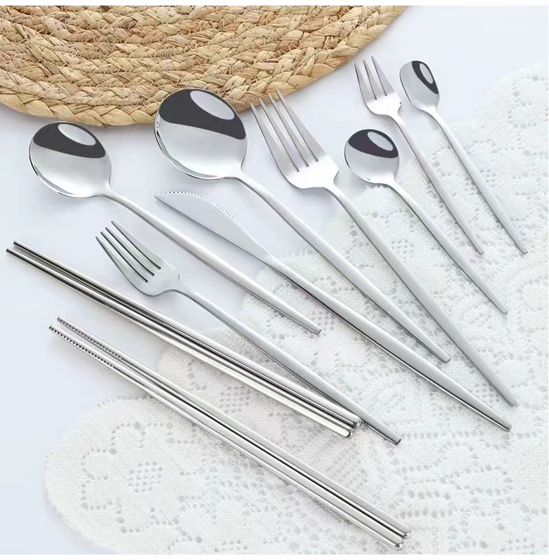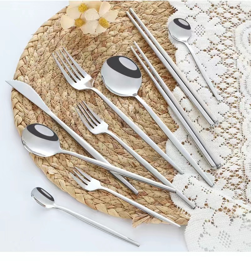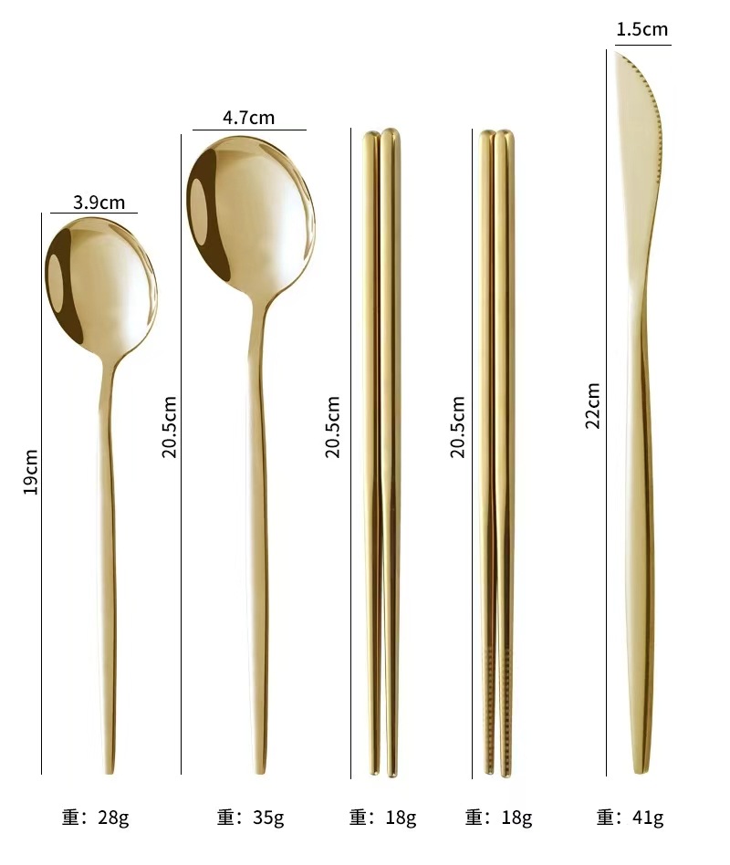 | Color | Cuchillo de comedor dorado, tenedor de comedor dorado, cuchara de comedor dorada, cuchara de postre dorada, tenedor de postre dorado, cuchara de té dorada, tenedor de fruta dorada, palillos dorados, palillos dorados (resistente de deslizamiento), cuchillo de comedor plateado, tenedor de comedor plateado, cuchara de postre plateada, tenedor de postre plateado, cuchara de té plateada, tenedor de fruta plateado, palillos plateados, palillos plateados (resistente de deslizamiento) |