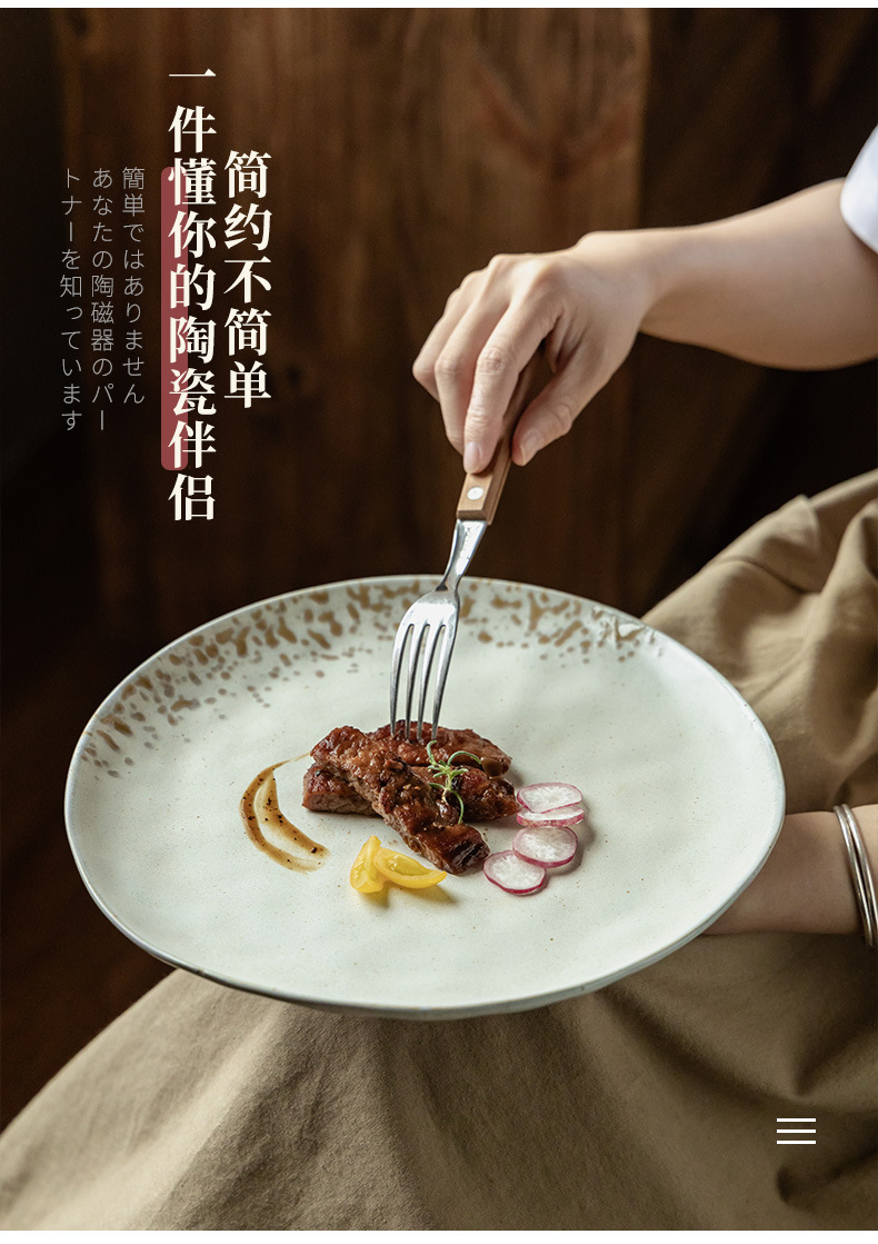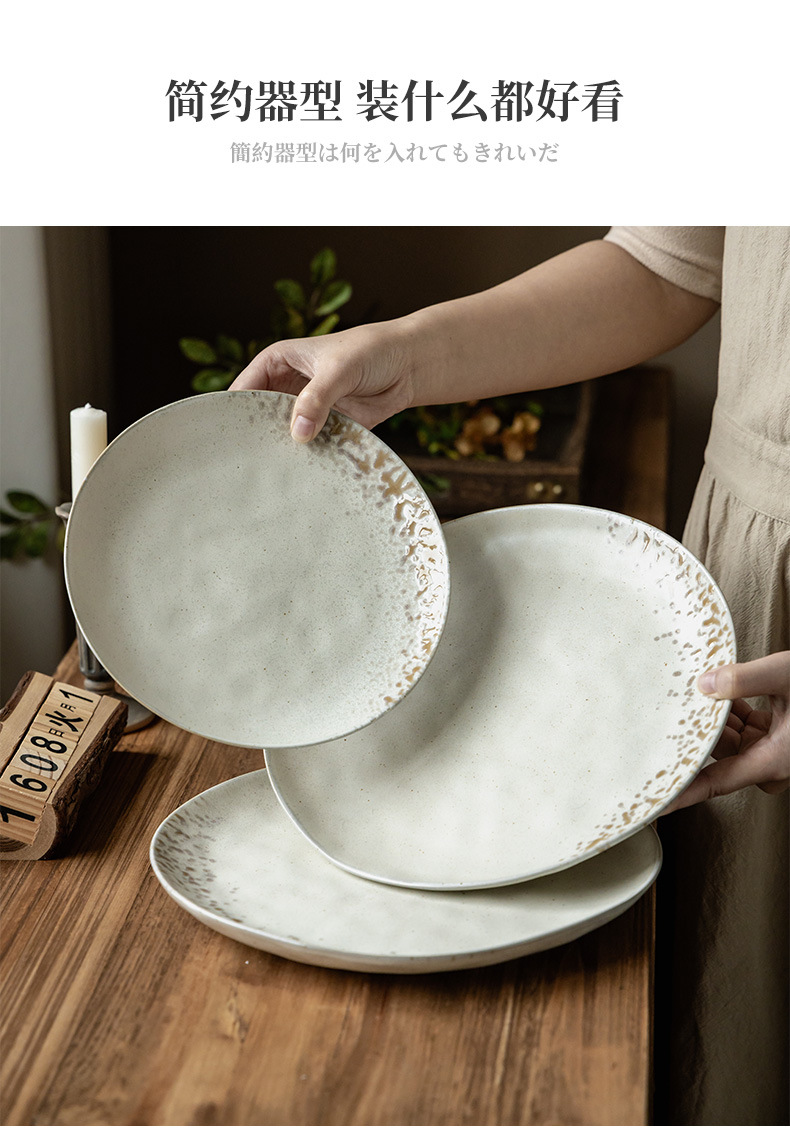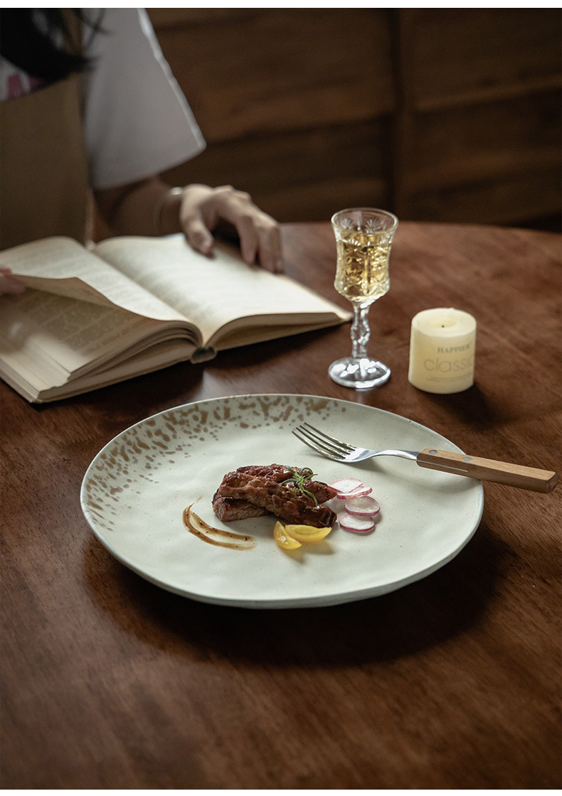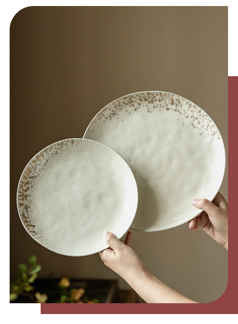 Plato de cerámica de textura retro, plato de filete occidental, plato redondo doméstico japonés al por mayor, platos de platos, platos de pasta