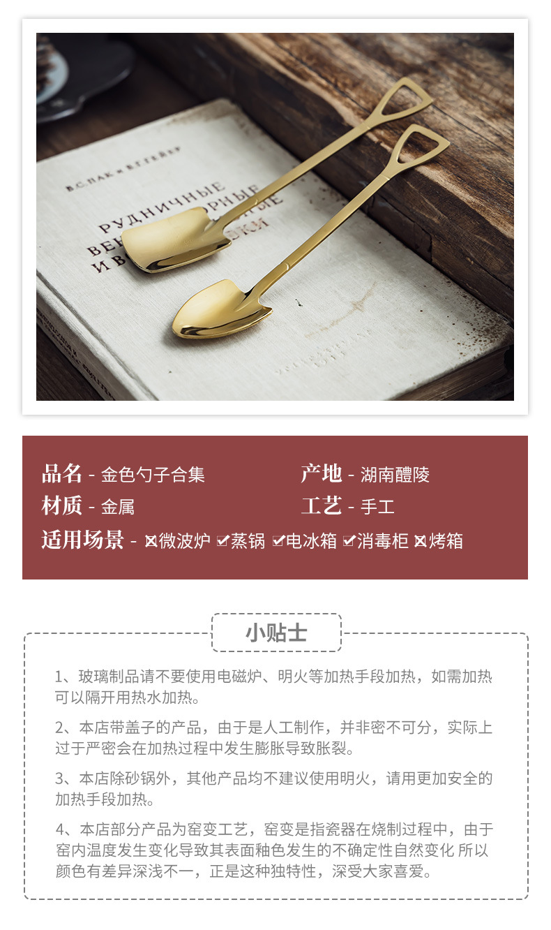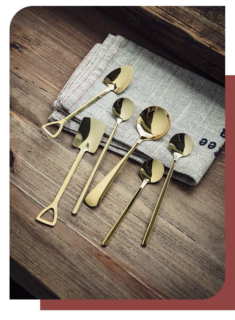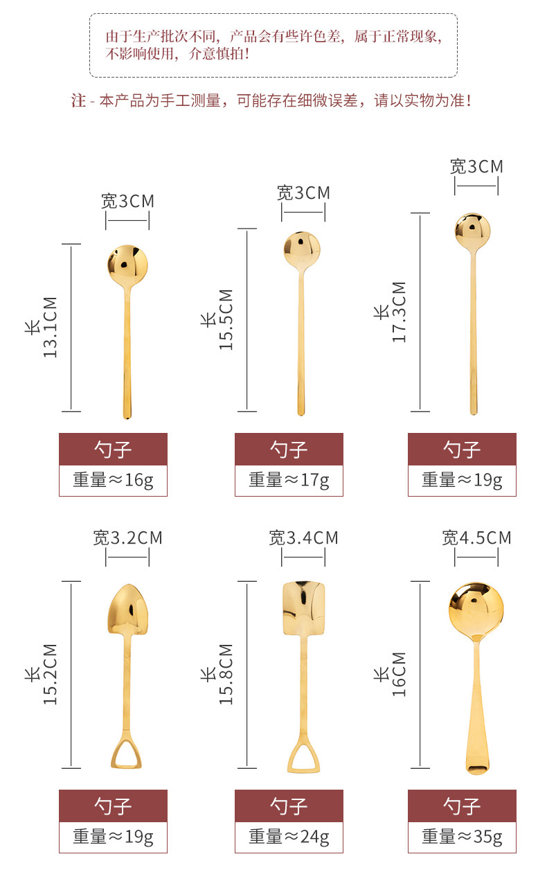 | Color | Cucharada triangular dorada 15.2CM, cucharada de café dorada 13.1CM, cucharada plana dorada 15.8CM, cucharada ovalada dorada 15.5CM, cucharada ovalada dorada 16CM, cucharada ovalada dorada 17.3CM |