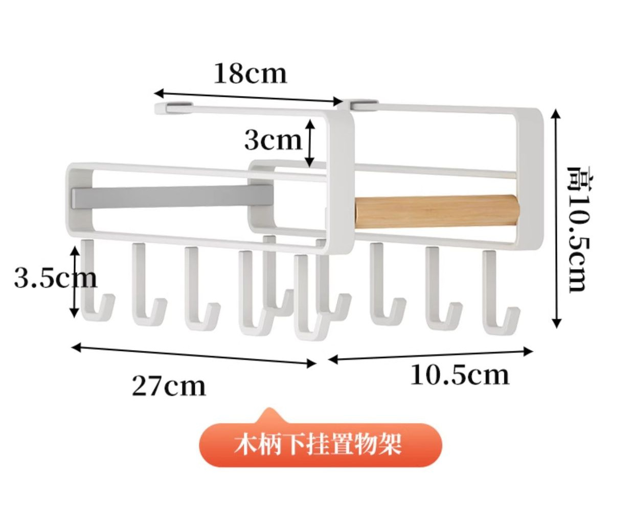 Debajo del mango de madera cuelga un estante de 10 tazas de ocho caracteres.
