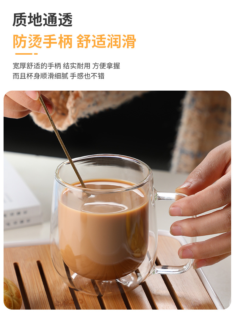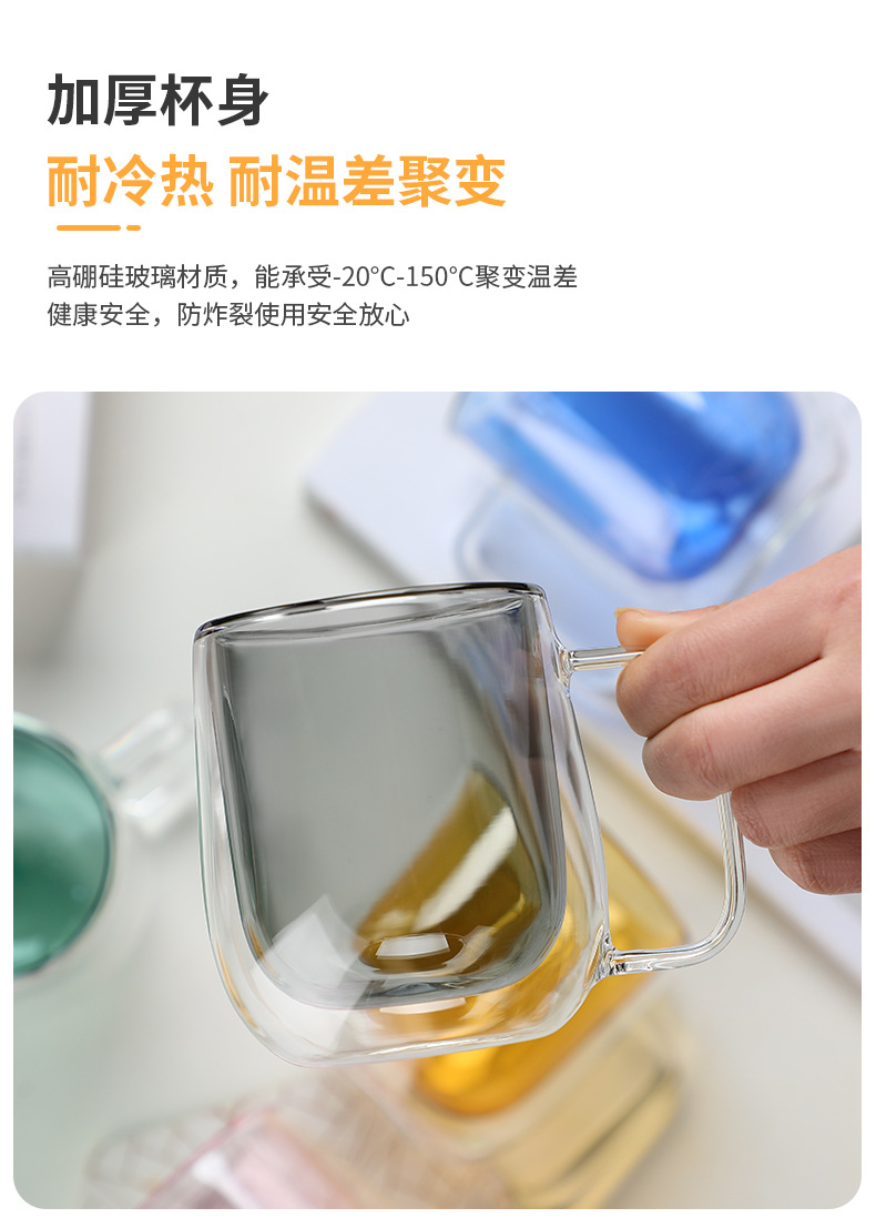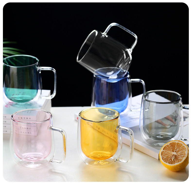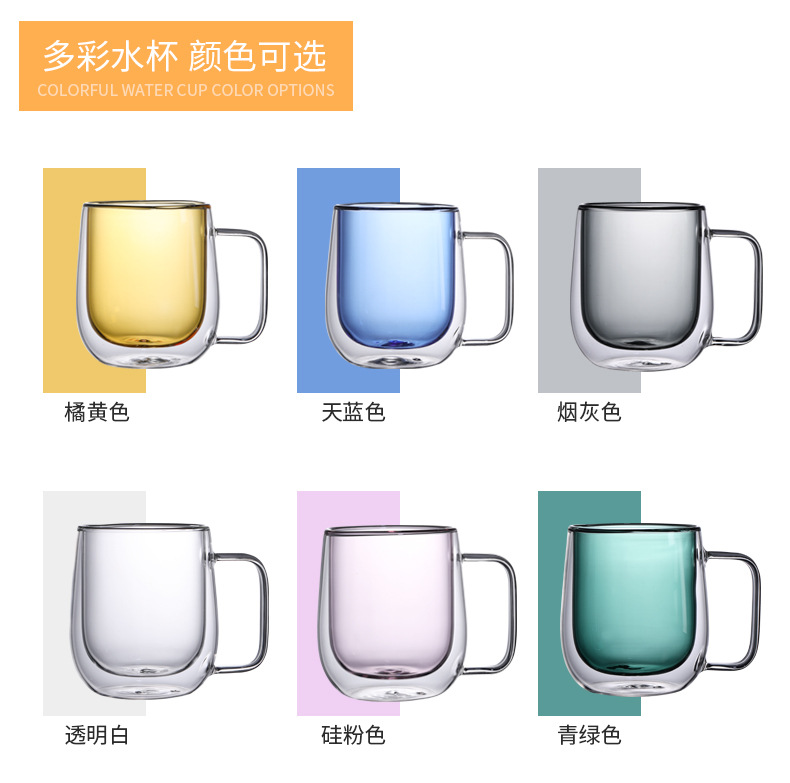 Taza de vidrio transparente de doble capa Taza de vidrio con borosilicato Taza de café transparente de color Taza de leche doméstica al por mayor