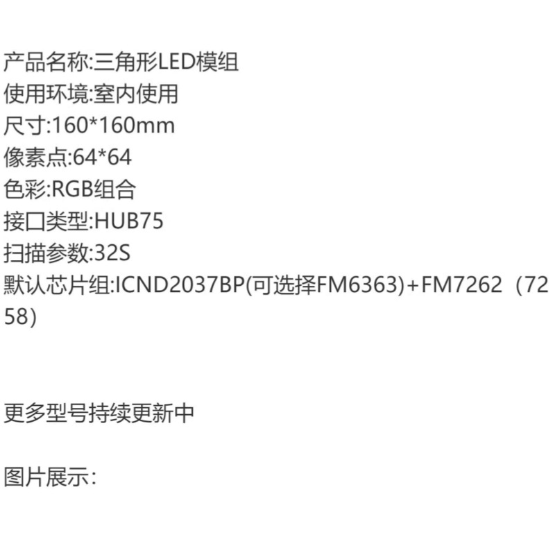 Especificaciones | Placas pequeñas p2.5 (8 * 8cm), placas pequeñas p2.5 (16 * 8cm), placas triangulares p2.5 a (16 * 16cm), placas triangulares p2.5 b (16 * 16cm), placas triangulares p2.5 c (16 * 16cm), placas triangulares p2.5 d (16 * 16cm), placas triangulares P4 a (25.6 * 12.8cm), placas triangulares P4 b (25.6 * 12.8cm), placas triangulares P4 c (25.6 * 12.8cm), placas triangulares P4 d (25.6 * 12.8cm), placas triangulares p2.5 (16 * 16cm), placas grandes P4 (32 * 16cm)tablero pequeño (12,8 * 6,4cm), módulo de visualización personalizado |