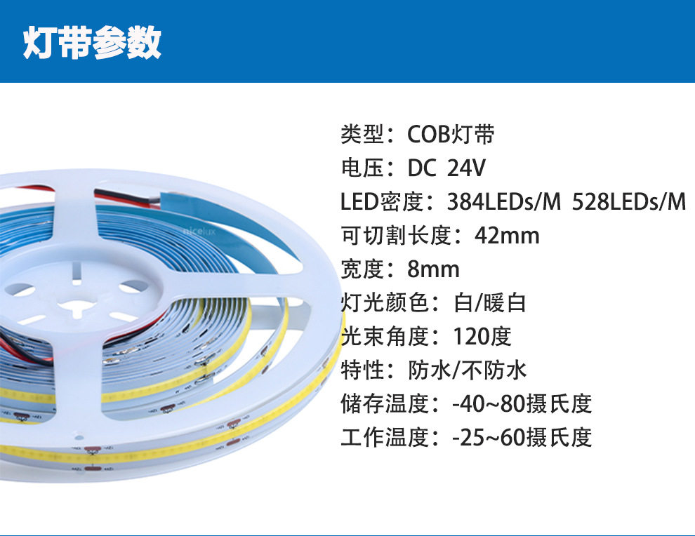Tira de luz LED COB monocromática flexible sin zona oscura, punto de luz lineal, tira LED tipo parche, blanco cálido, 528 luces integradas, luz lineal