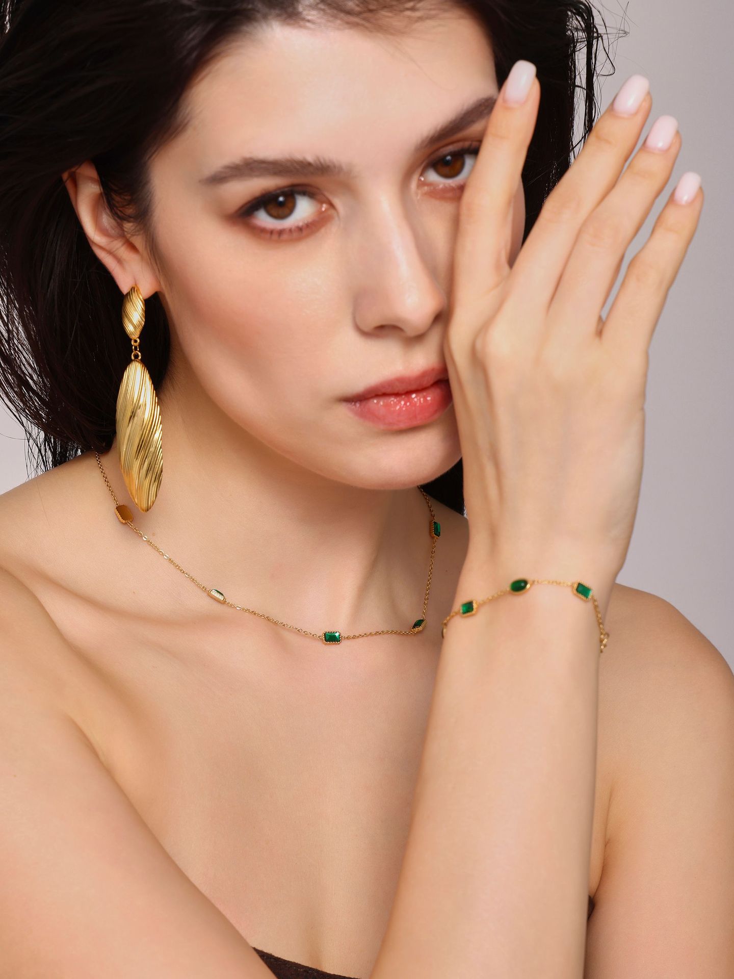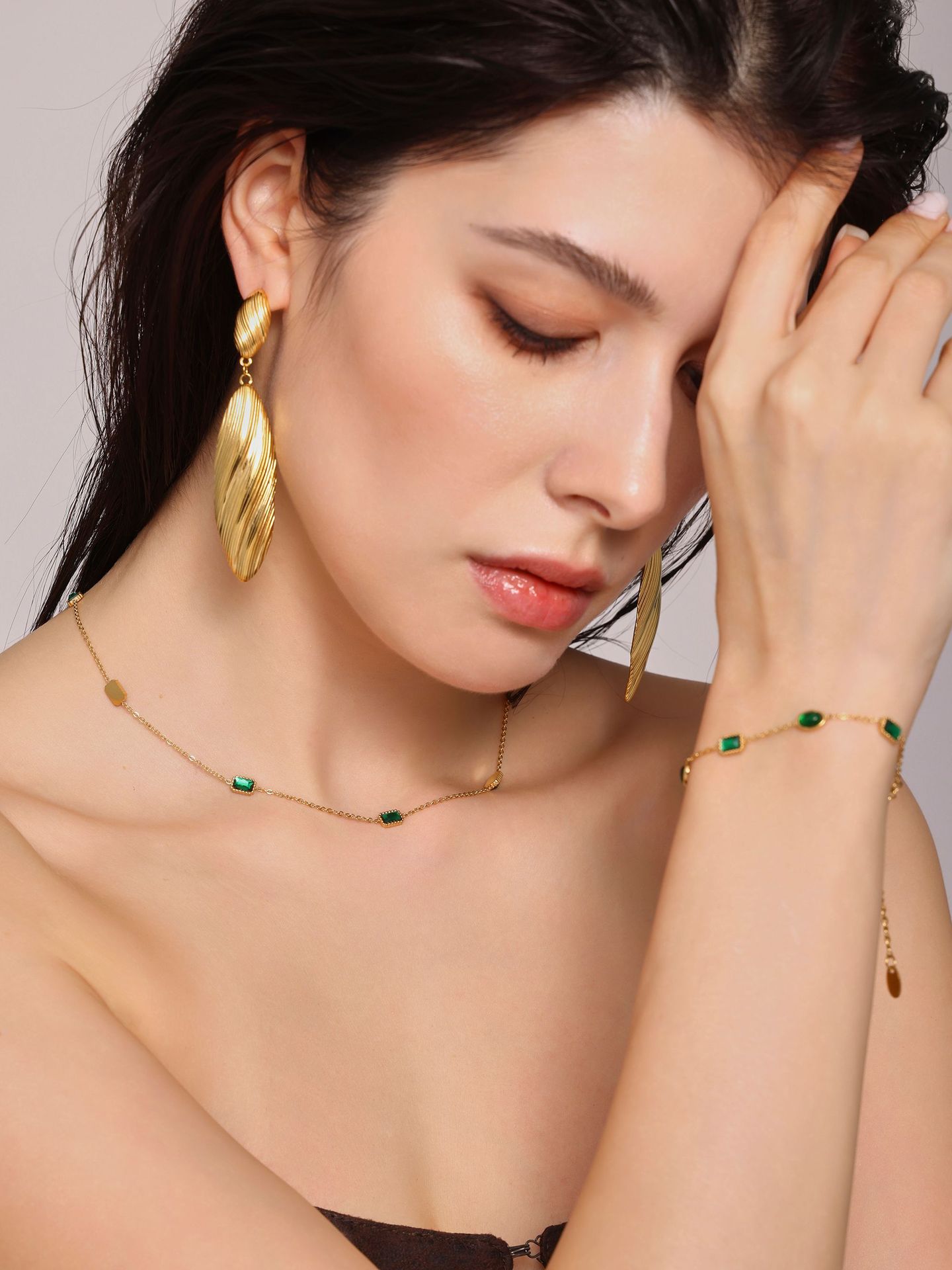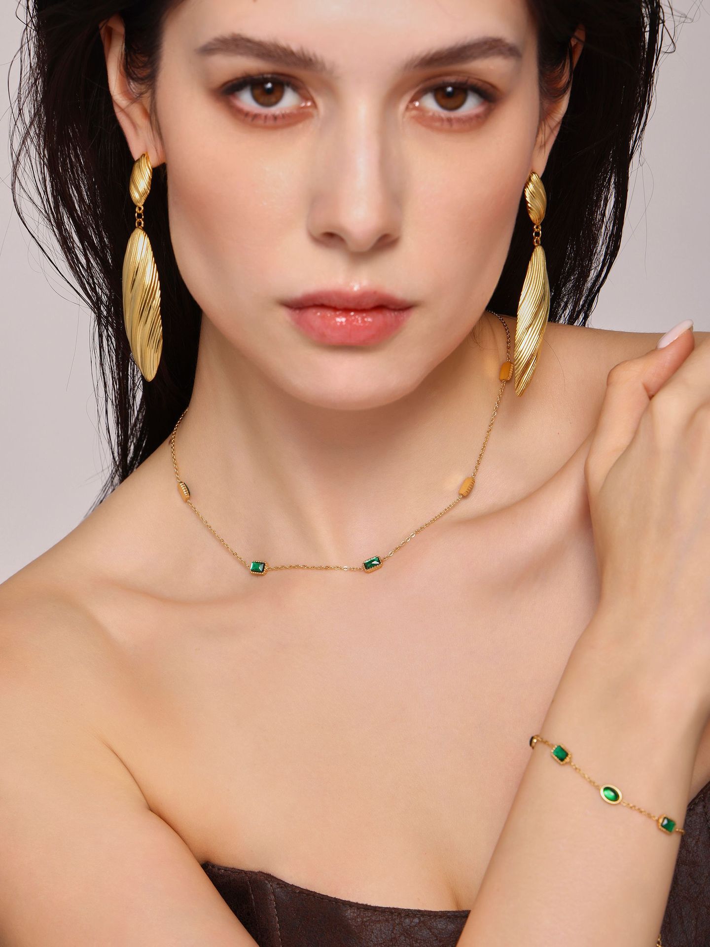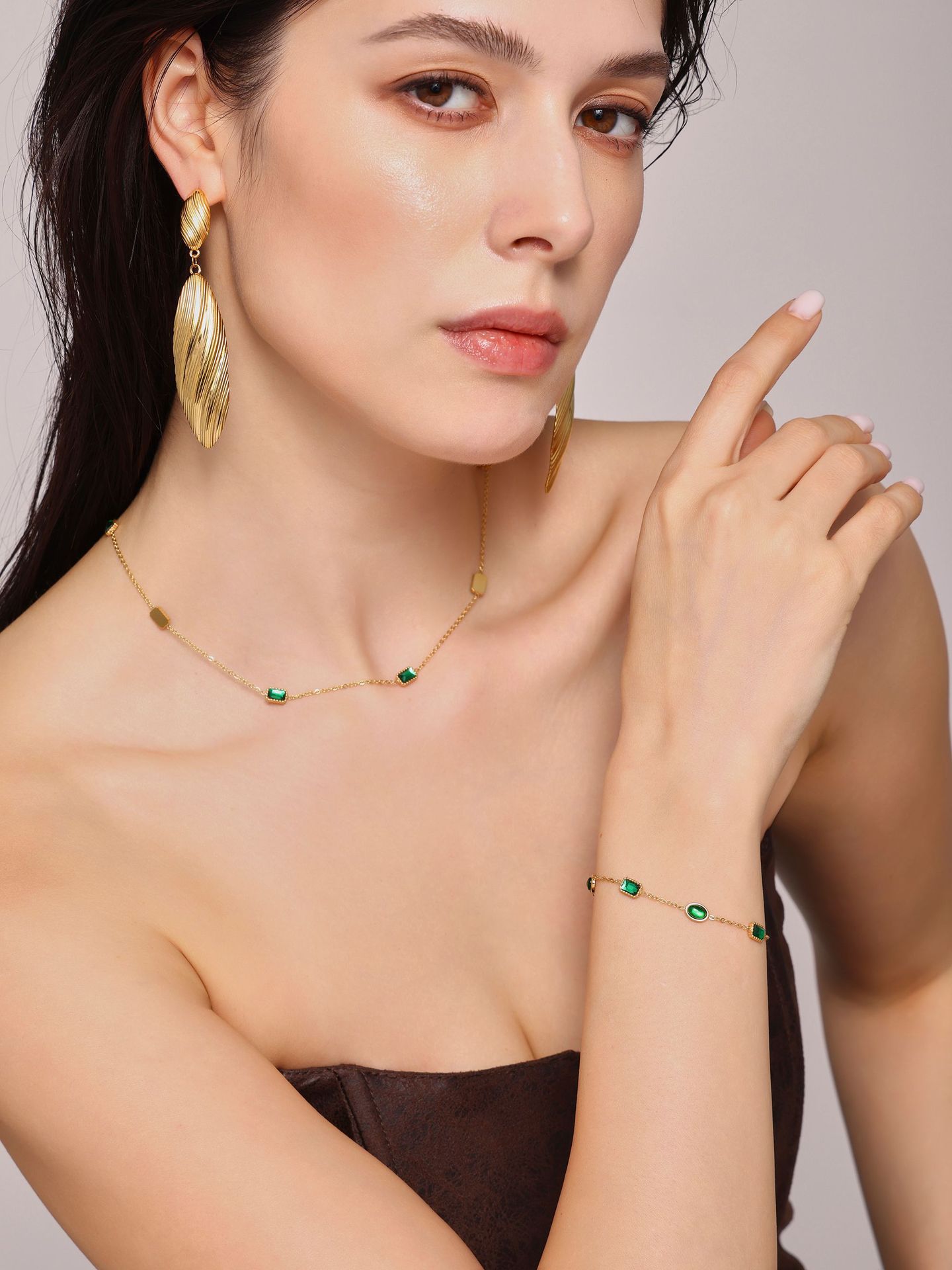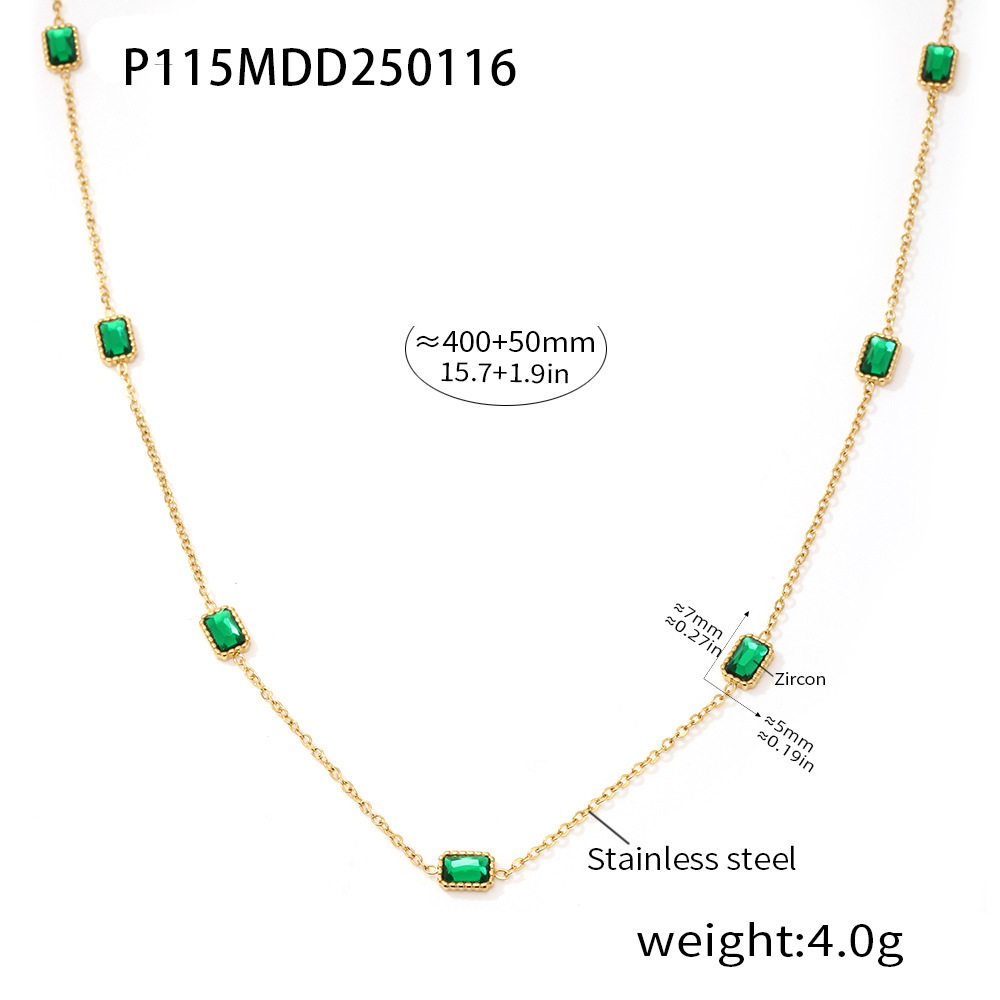 Zircón de acero inoxidable incrustado a mano collar de zircón esmeralda pulsera en un conjunto de estilo de nicho hermoso
