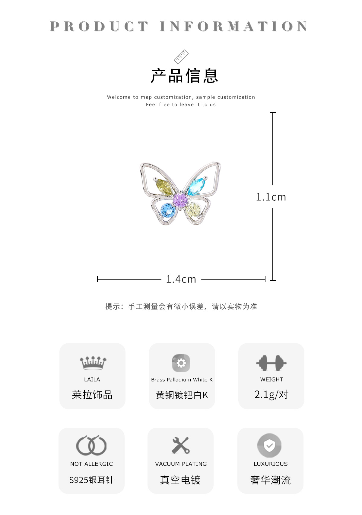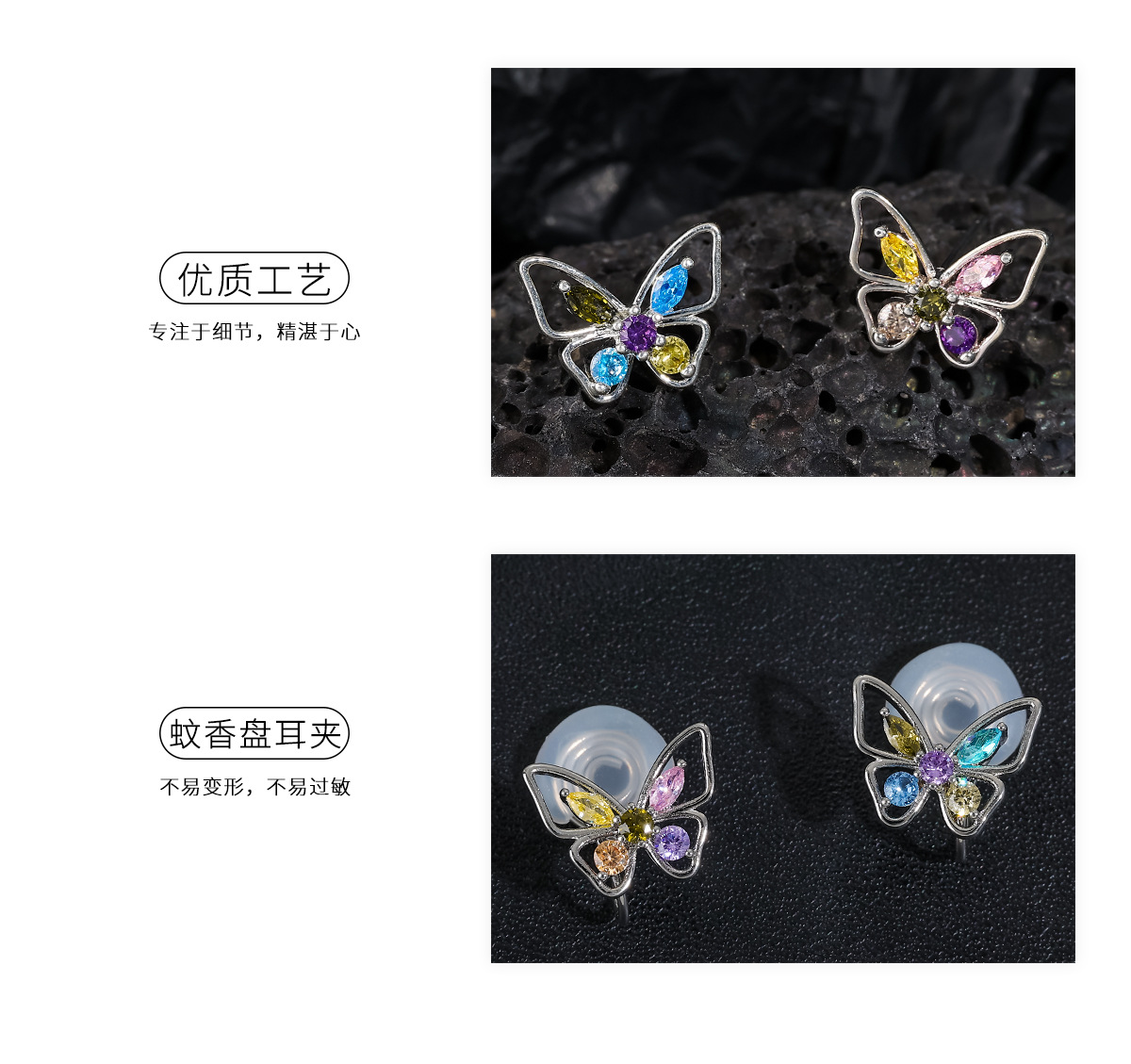 Mosquito bobina clip de oreja hembra sin oreja S925 aguja de plata con incrustaciones de color circonio mariposa pequeña oreja espárragos nicho Mini exquisitos pendientes