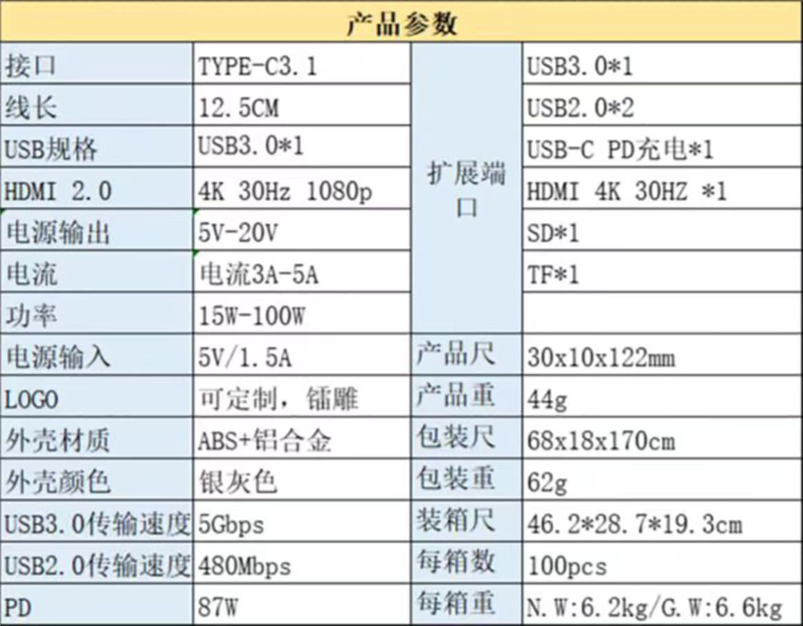 | Número de interfaces | Type-c siete en uno usb3.0 2.0 PD carga TF/SD HDMI,Type-c cuatro en uno usb3.0 2.0 HDMI PD carga,Type-c cinco en uno usb3.0 2.0 PD carga HDMI,Type-c seis en uno usb3.0 2.0 PD carga SD/TF HDMI,Type-c tres en uno usb.3.0 HDMI PD carga,Type-c ocho en uno usb3.0 2.0 PD transmisión de datos de carga HDMI TF/SD 100 M puerto de red,Type-c nueve en uno usb3.0 2.0 PD carga transmisión de datos SD/TF HDMI 100 M puerto,Type-c diez en uno usb3.0 2.0 PD carga HDMI SD/TF VGA 100 M puerto de red,Tipo c once en uno usb3.0 2.0 SD/TF 100 M puerto de red audio HDMI VGA PD carga,Tipo-c doce en uno usb3.0 2.0 SD/TF 100 M puerto de audio HDMI VGA PD datos de carga |