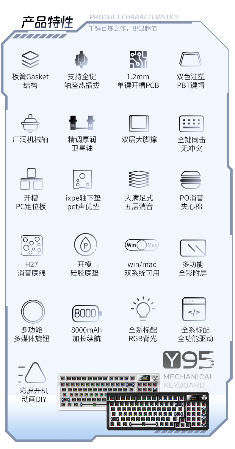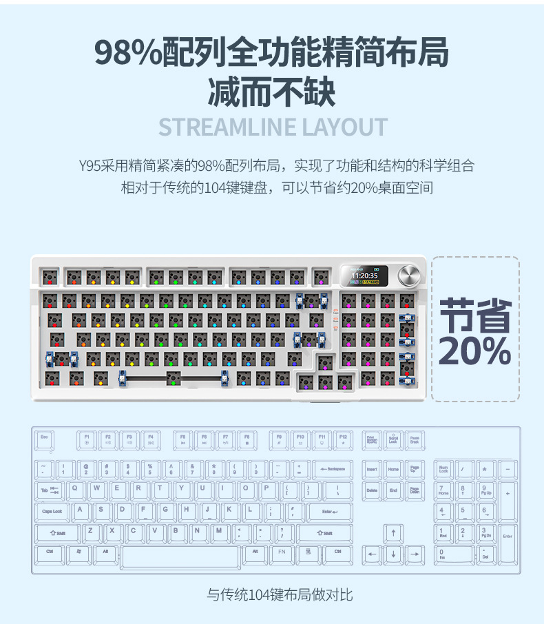 Teclado mecánico de plata 95D triple modo AS cristal de hielo transparente PC inalámbrico Bluetooth 98 matriz RGB cableado teclado personalizado