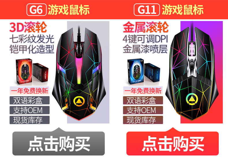 Talla de plata G11 rodillo de metal con cable 4-botón luminoso ratón juego USB accesorios de computadora Amazon transfronteriza al por mayor