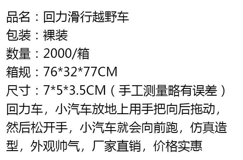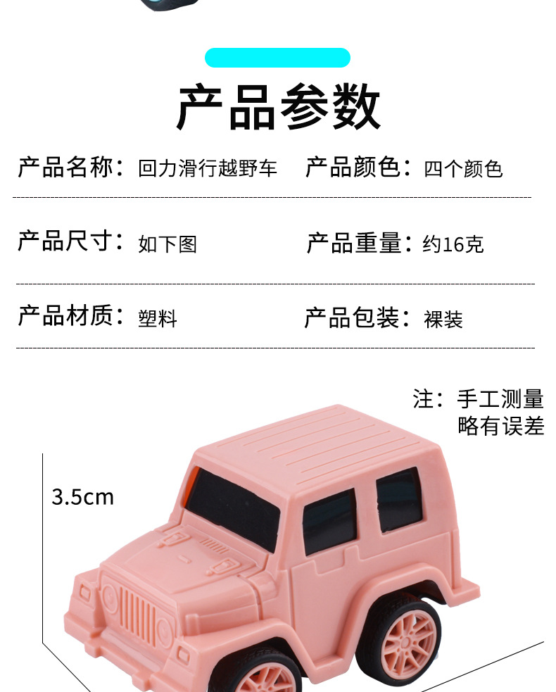| Color | Tire hacia atrás deslizante vehículo todoterreno-color aleatorio |