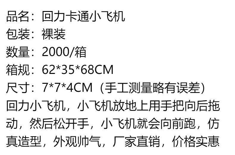 | Colores | # 【Color】 Avión pequeño de retroceso #-Color aleatorio,# 【Blanco purés】 Avión pequeño de retroceso #-Color aleatorio |