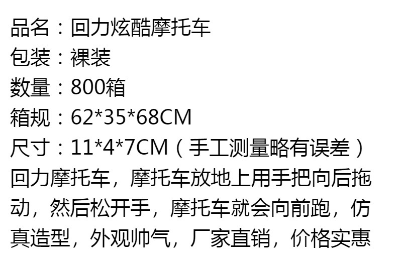 | Color | Tire hacia atrás la motocicleta-color aleatorio |